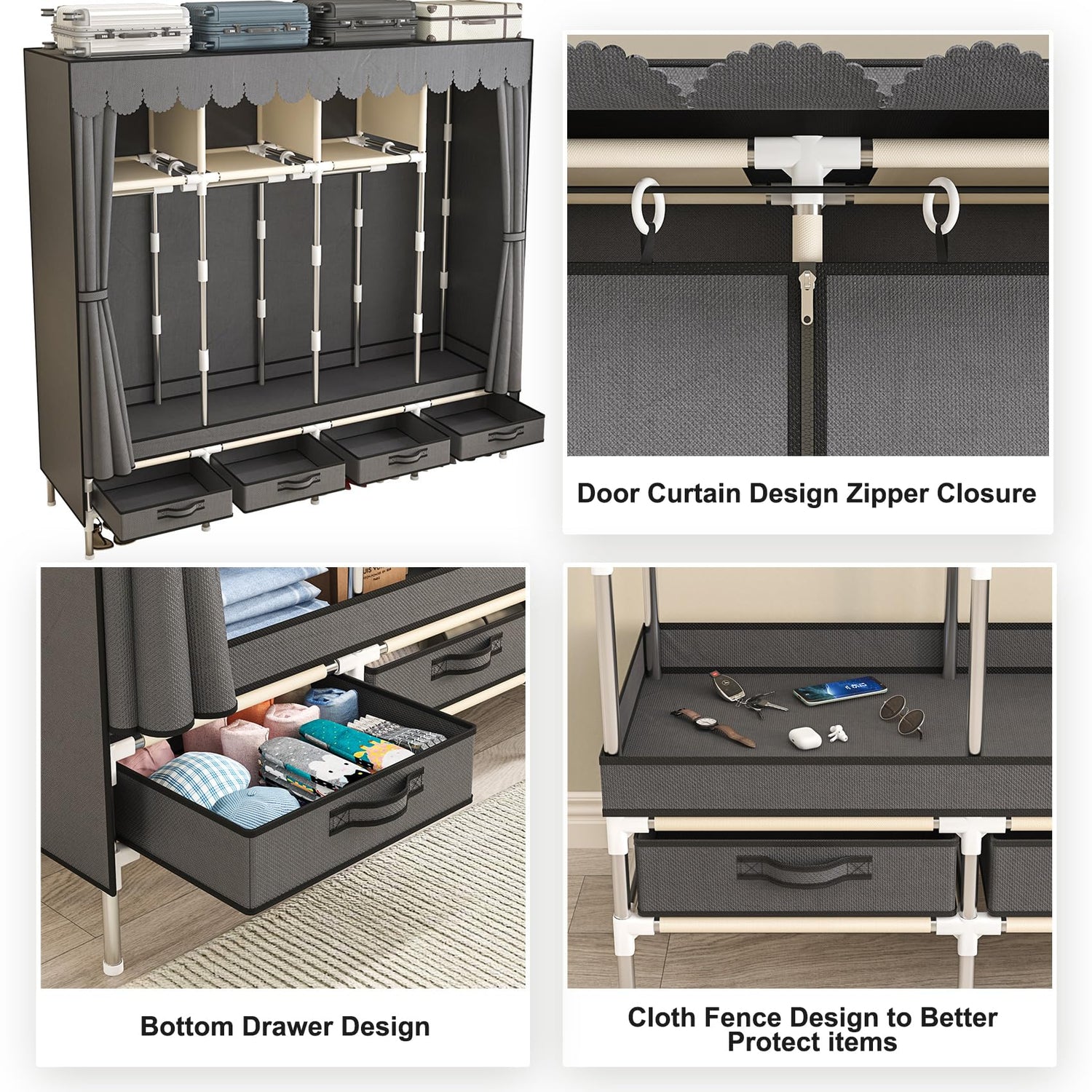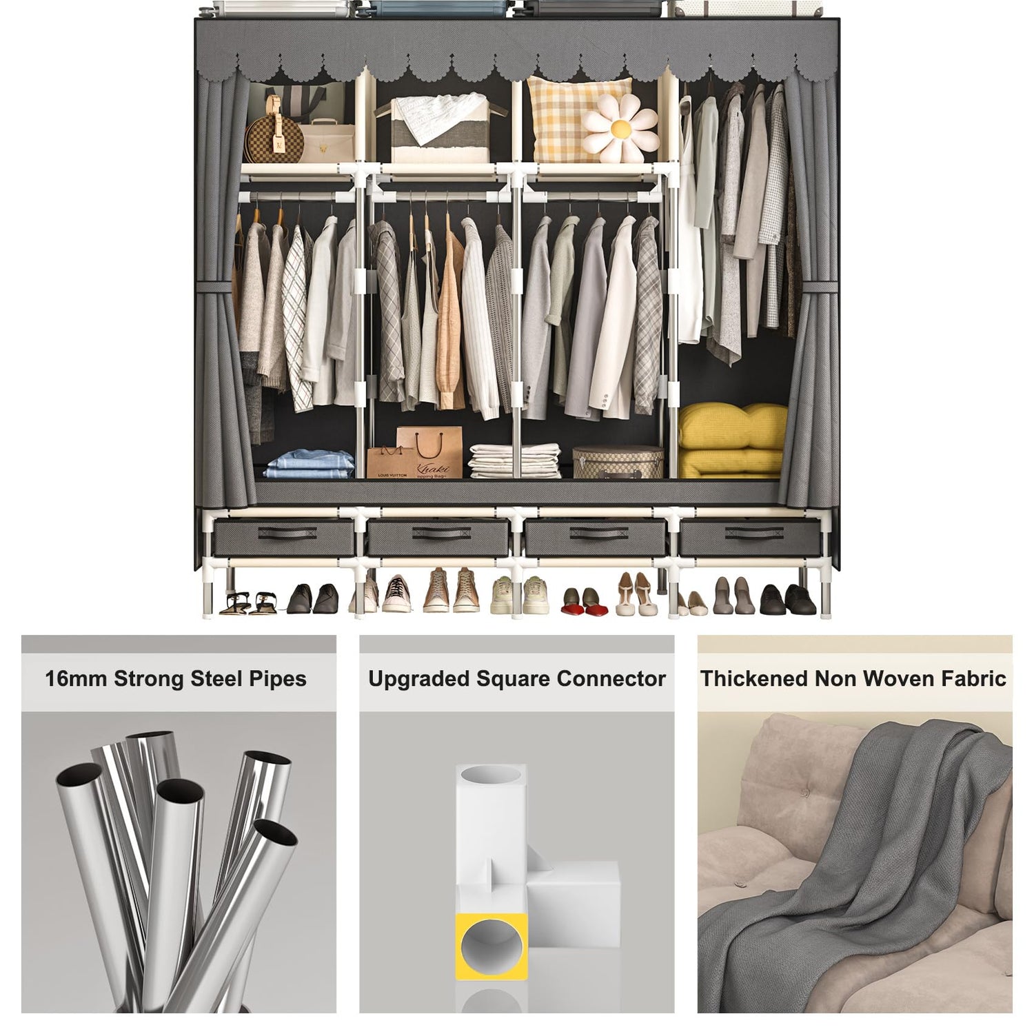 LEAIJIAFY Large Portable Armoire Wardrobe Closet with 4 Hanging Rods and Drawers,Gray Metal Storage Wardrobe Clothes Rack with Dust Cover for Hanging Clothes,67.7 in Width,Bedroom