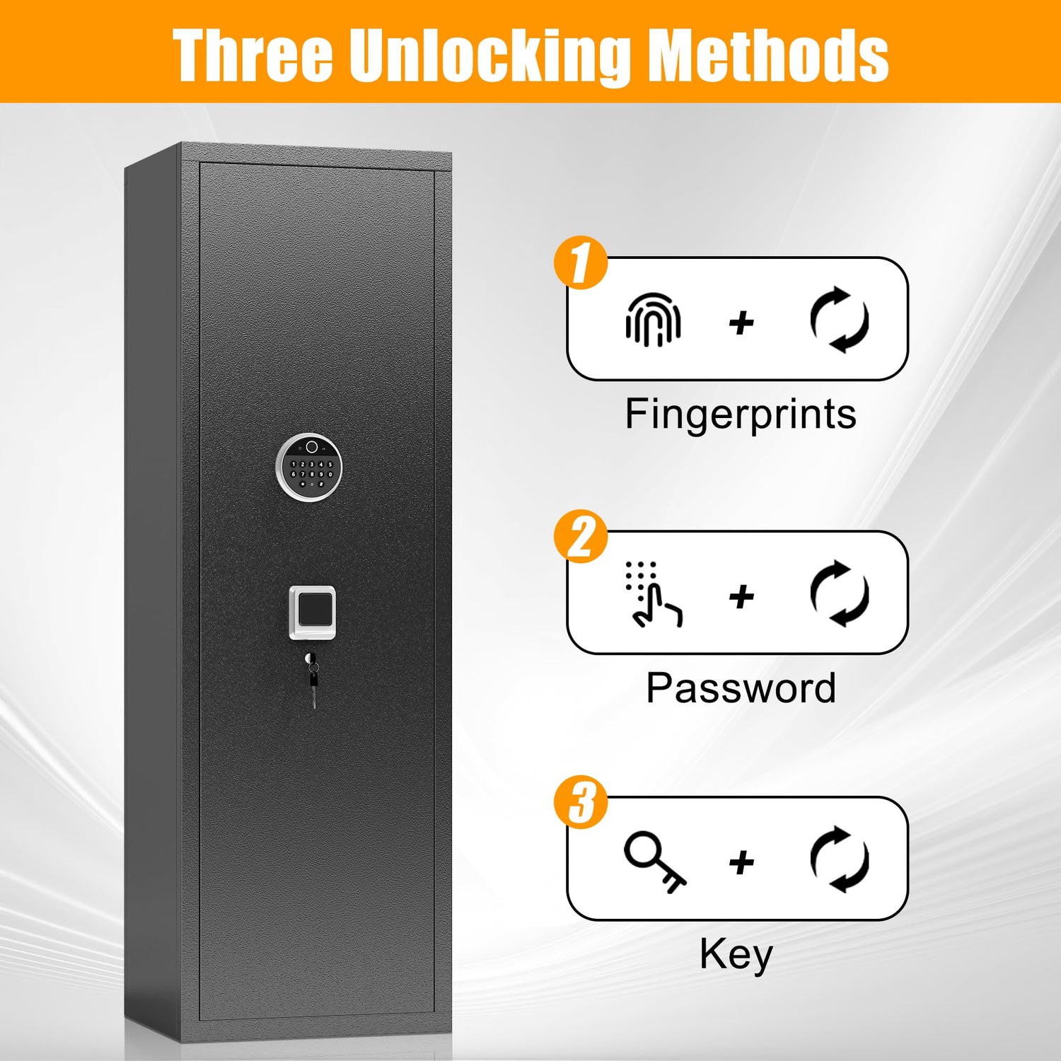 - 【Triple Unlocking System】This gun safe offers three unlocking methods: fingerprint, password and key to meet different users' needs. Fingerprint unlocking is fast and secure, password unlocking is easy to memorize, and key unlocking serves as a back-up solution, ensuring easy access to firearms in any situation. Triple security guarantees you no worries.