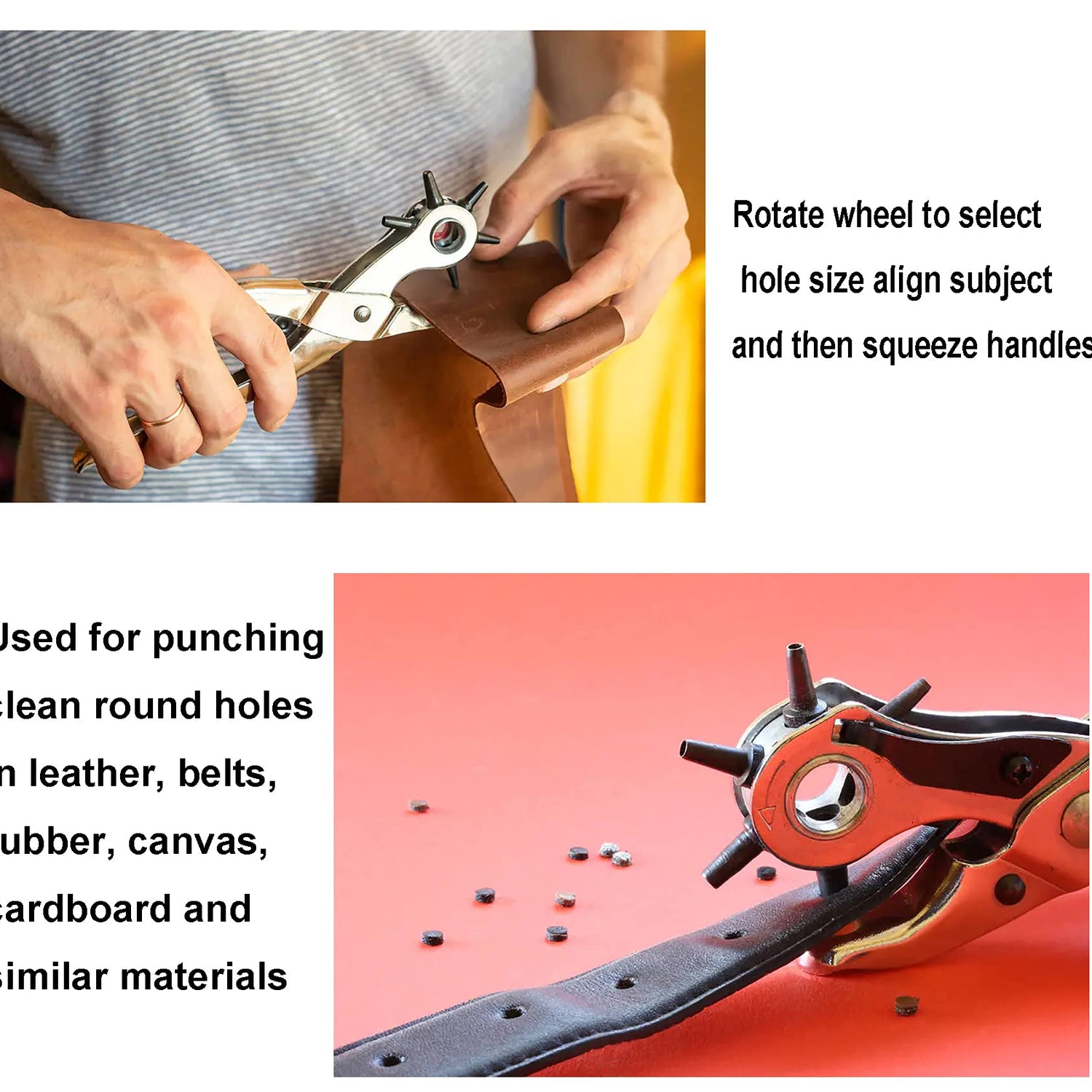- 【Comfortable】 grip handle punch clean and neat holes in leather, rubber, plastic, canvas, cardboard, polyurethane, fabrics, silk and more.