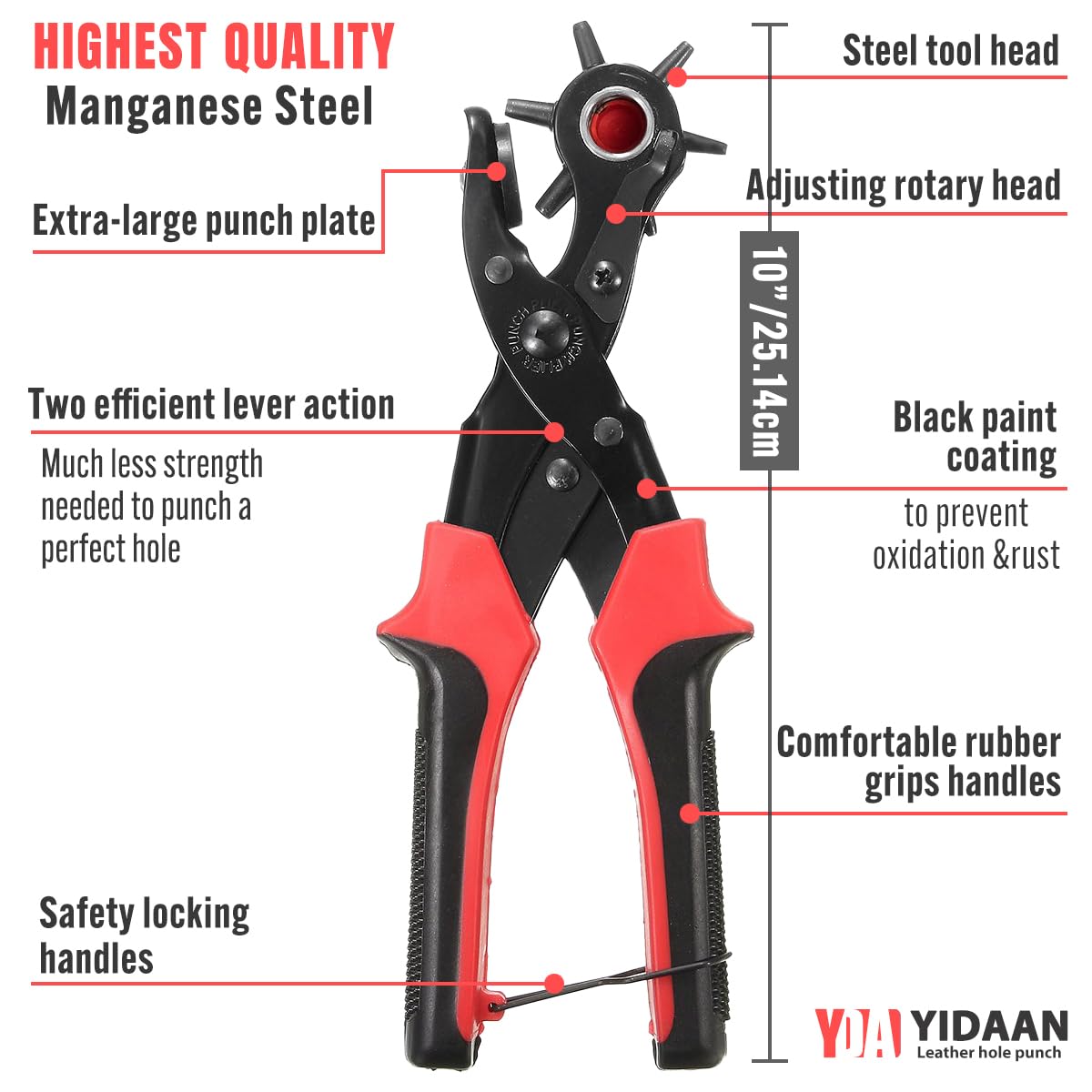 - 【Ergonomics & Comfortable Design】The professional leather hole punch adopts the double-lever mechanism to greatly save your strength. Ideal for long, repetitive work without causing sore hands or blisters because the handles are cushioned, non-slip and ergonomic.