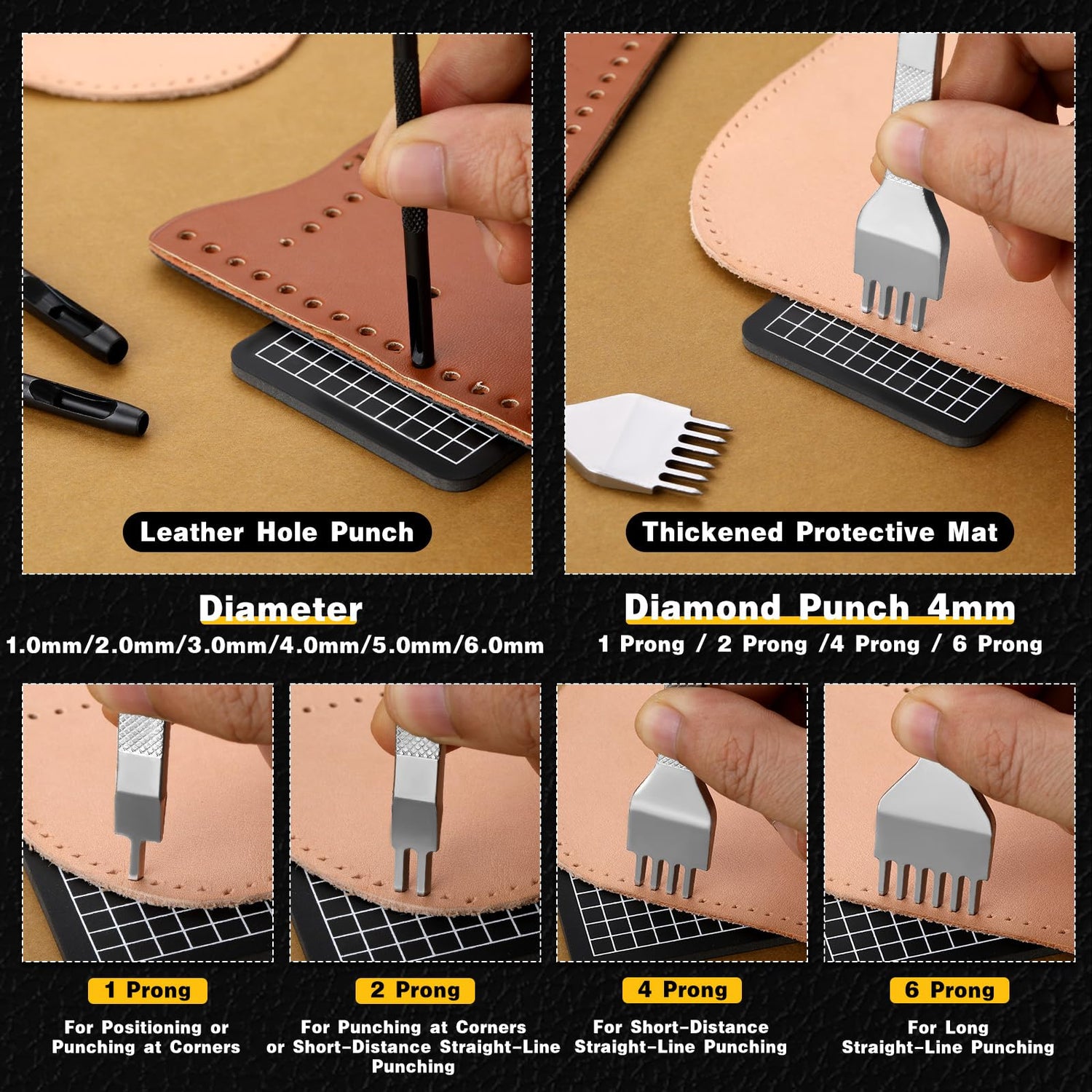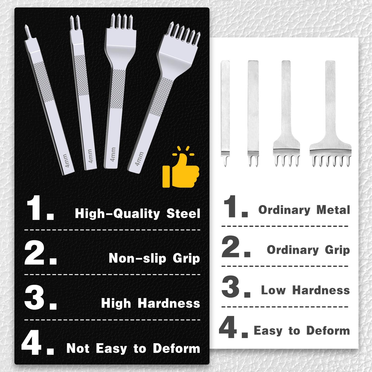 - LACING STITCHING CHISEL SET: These 1/2/4/6 leather punches are made of high-quality steel for reliable performance, rust and corrosion resistance, and durability. After fine polishing, the handle is comfortable and the punch tip is sharp. Each punch stitching hole tool has a sharp, well-defined prong to help punch quickly, which can create clean and accurate holes to make your stitches even and beautiful.