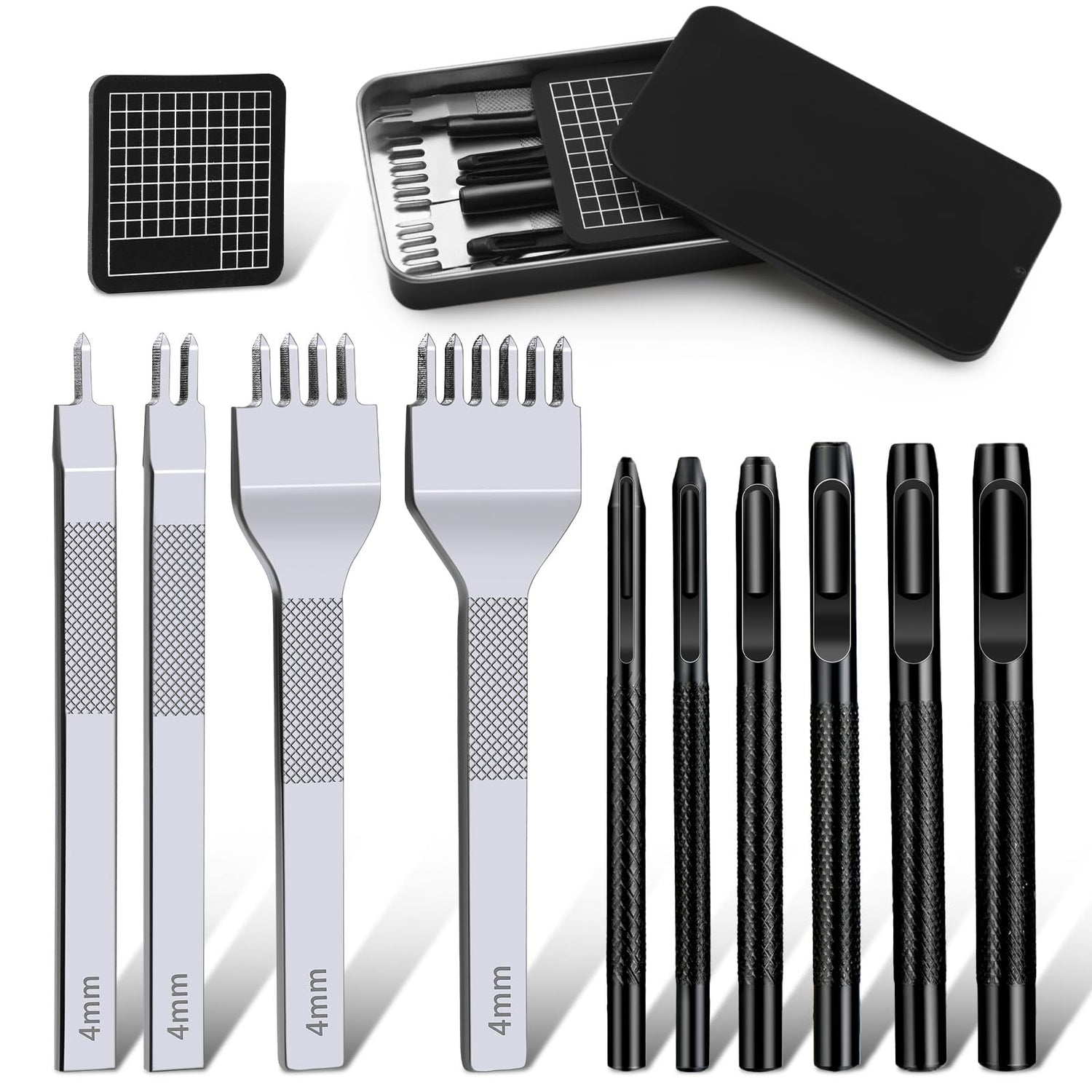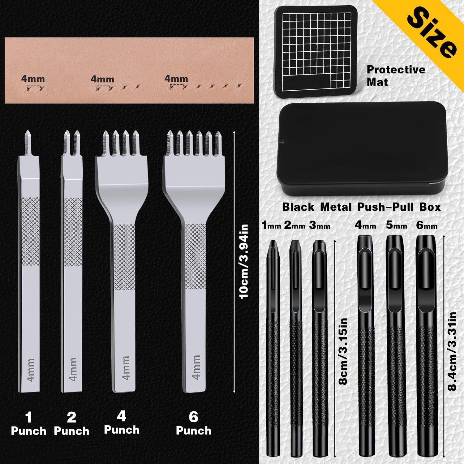 - LEATHER PUNCH TOOL: You will get a 4mm 1/2/4/6 leather stitching punches set, 6 hollow punches with different sizes, a cutting mat, and a black metal push-pull box. This is a very practical stitching punch set. All the leather punch tools are packed in a metal push-pull box, which is neatly stored and easy to carry.