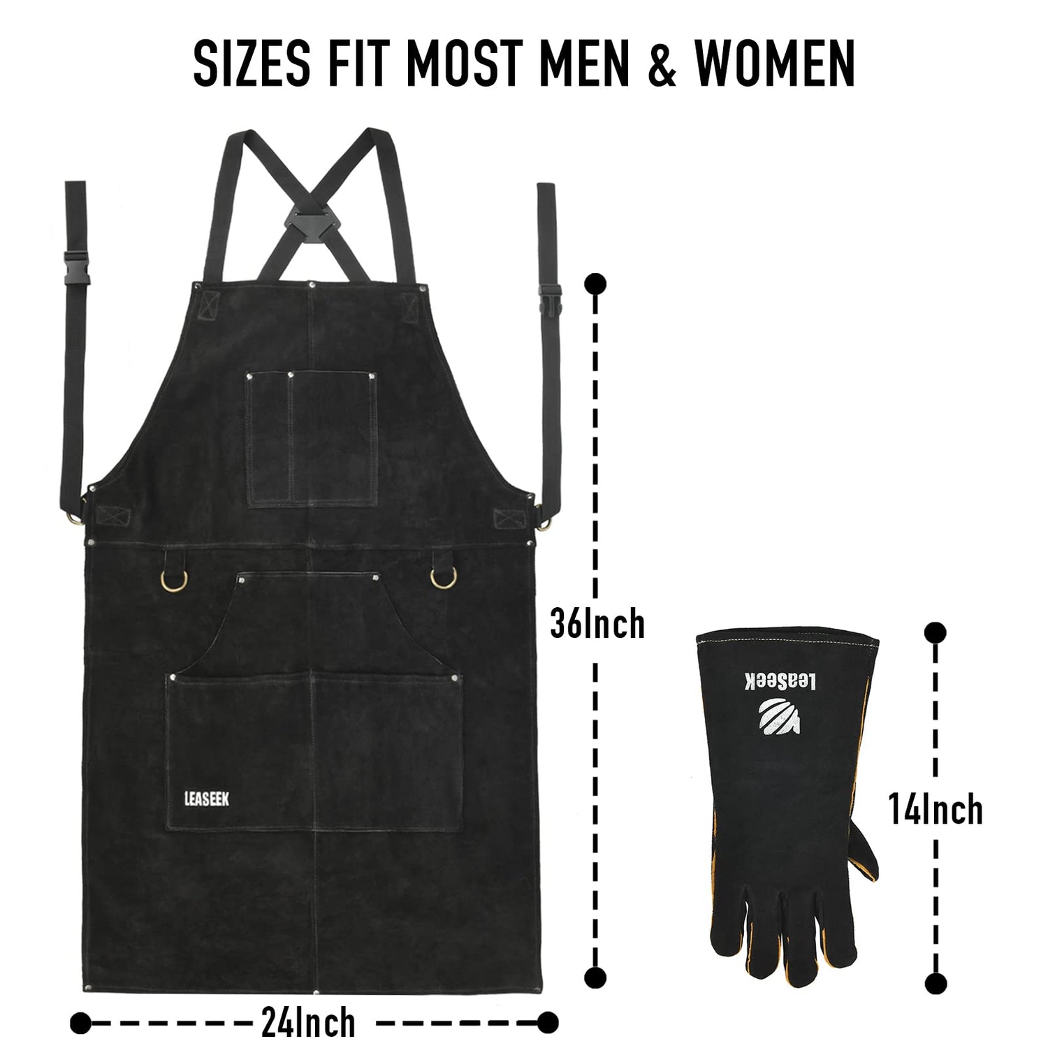 - Protection & Durable: Heat & Spark-Resistant heavy duty split cowhide leather welding apron. Top quality 24 inches wide x 36 inches long full coverage forging apron and gloves protects you until the knee when you are working.it is wear & flame-resistant.