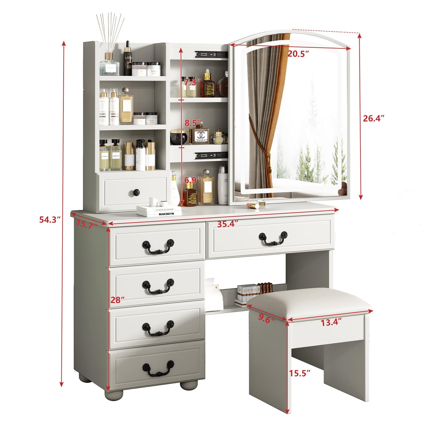 - 【Multifunctional & Storage Convenience】: This vanity desk has enough makeup area and comes with 6 enlarged drawers, 3 hidden storage spaces and 4 open shelves, Spacious and ample multi-size storage space can meet different storage needs for cosmetics, decorations and various jewelry.