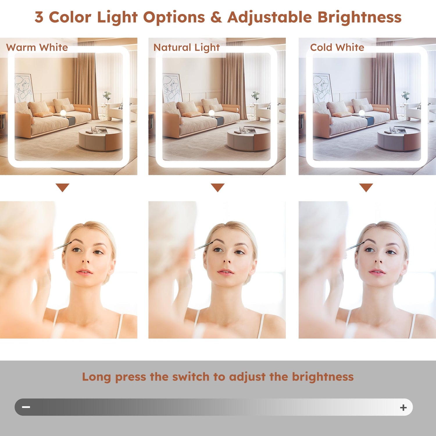 - 【HD LED Sliding Mirror】: The makeup vanity is equipped with a touch-sensitive switch HD LED sliding vanity mirror that provides superior clarity of illumination mirror reflection. 3 Lights models available in warm, natural and cool colors, it ensures that you will be able to perfectly finish your makeup in any light without missing any details.