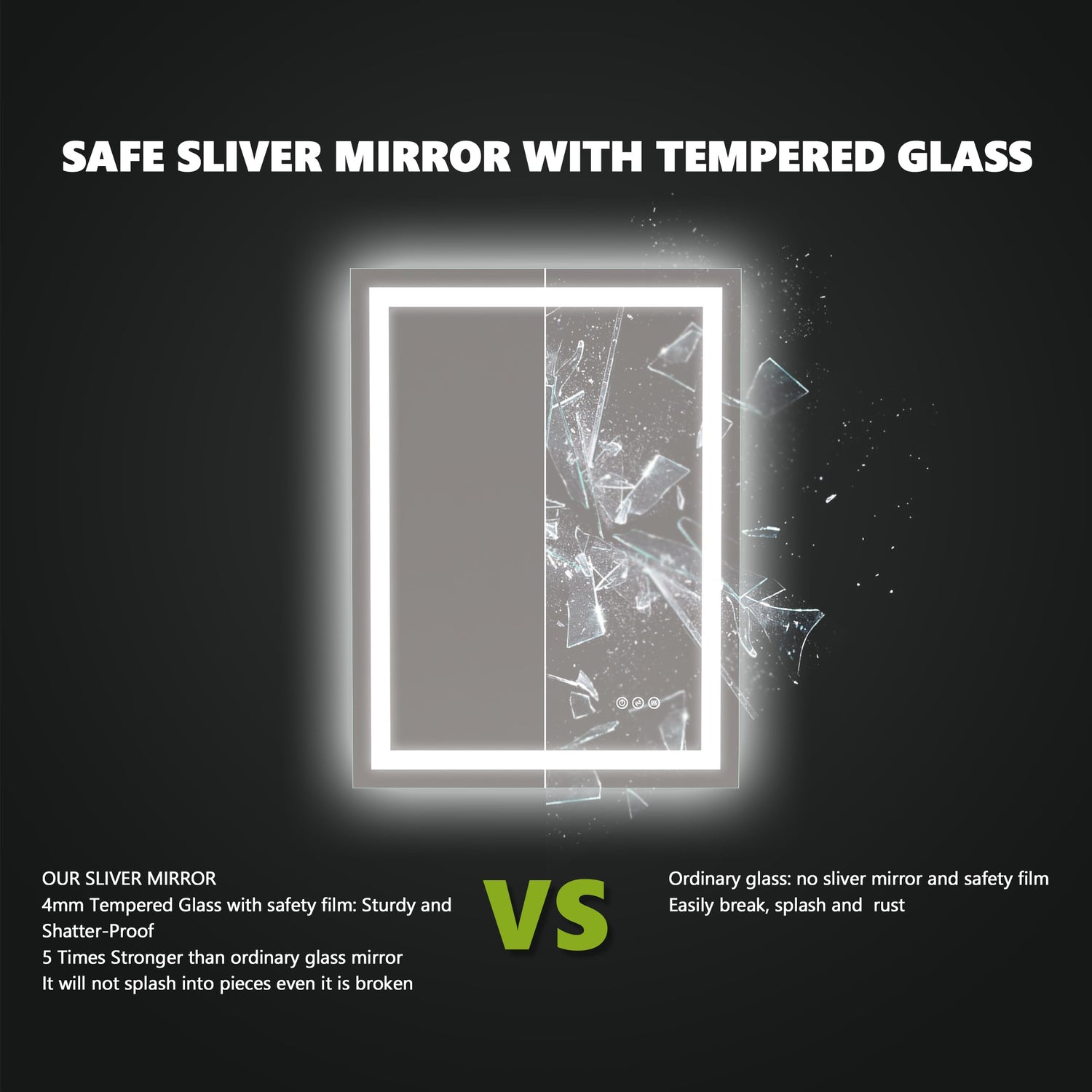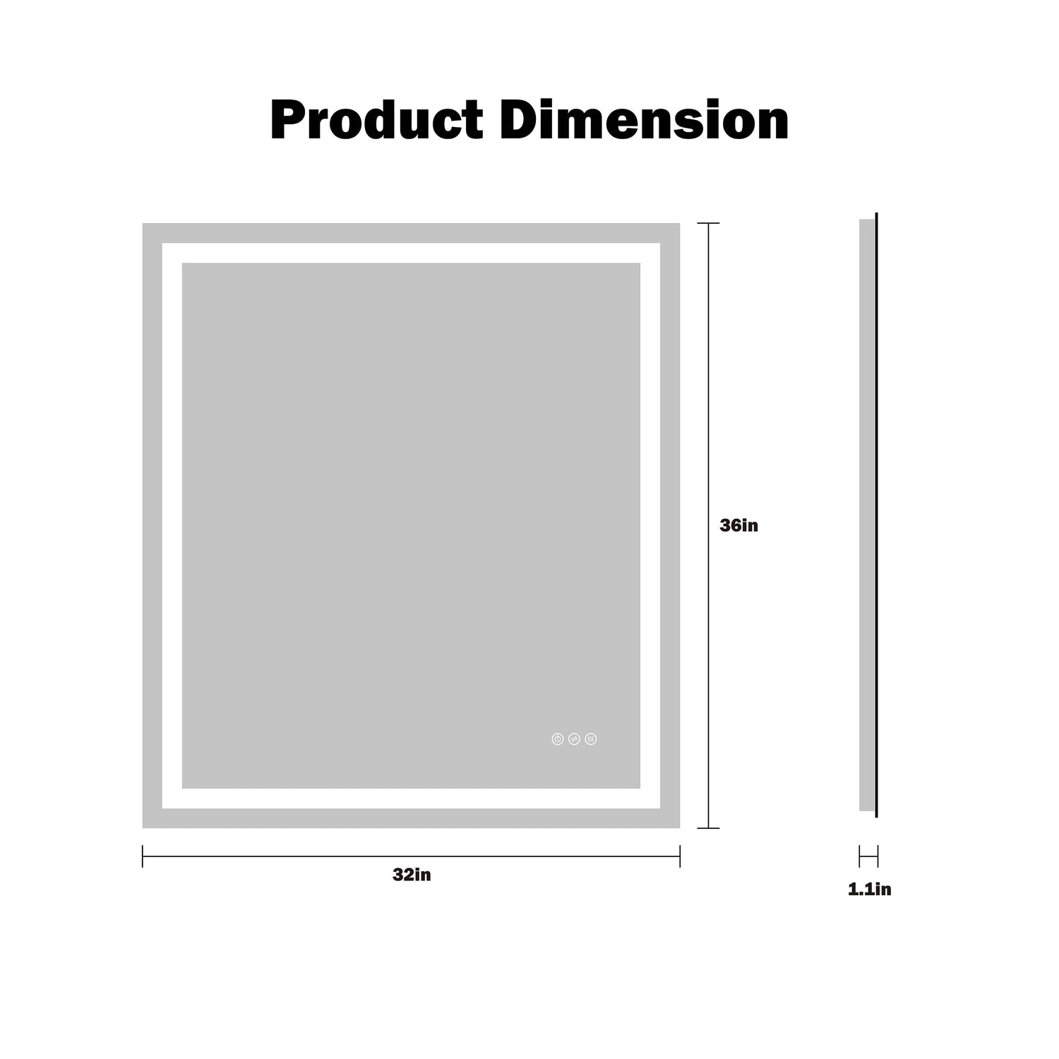 Details: LED Bathroom Mirror Lights 32x36 Inch Front Lighted Vanity Mirror, Wall Mounted Anti-Fog Dimmable LED Makeup Mirror, IP54 3K-6K Warm/Natural/Daylight, Tempered Glass (Horizontal/Vertical) UL Listed