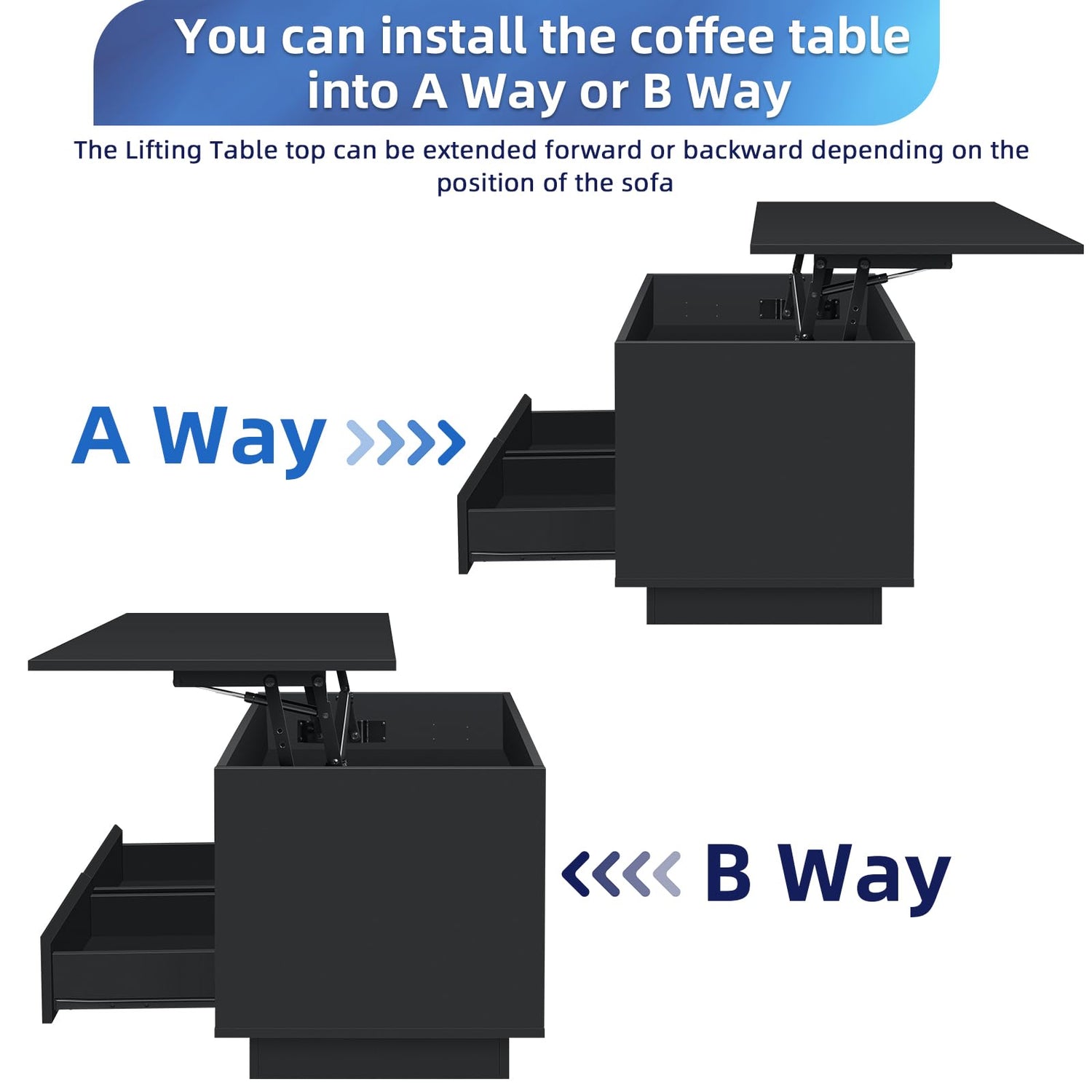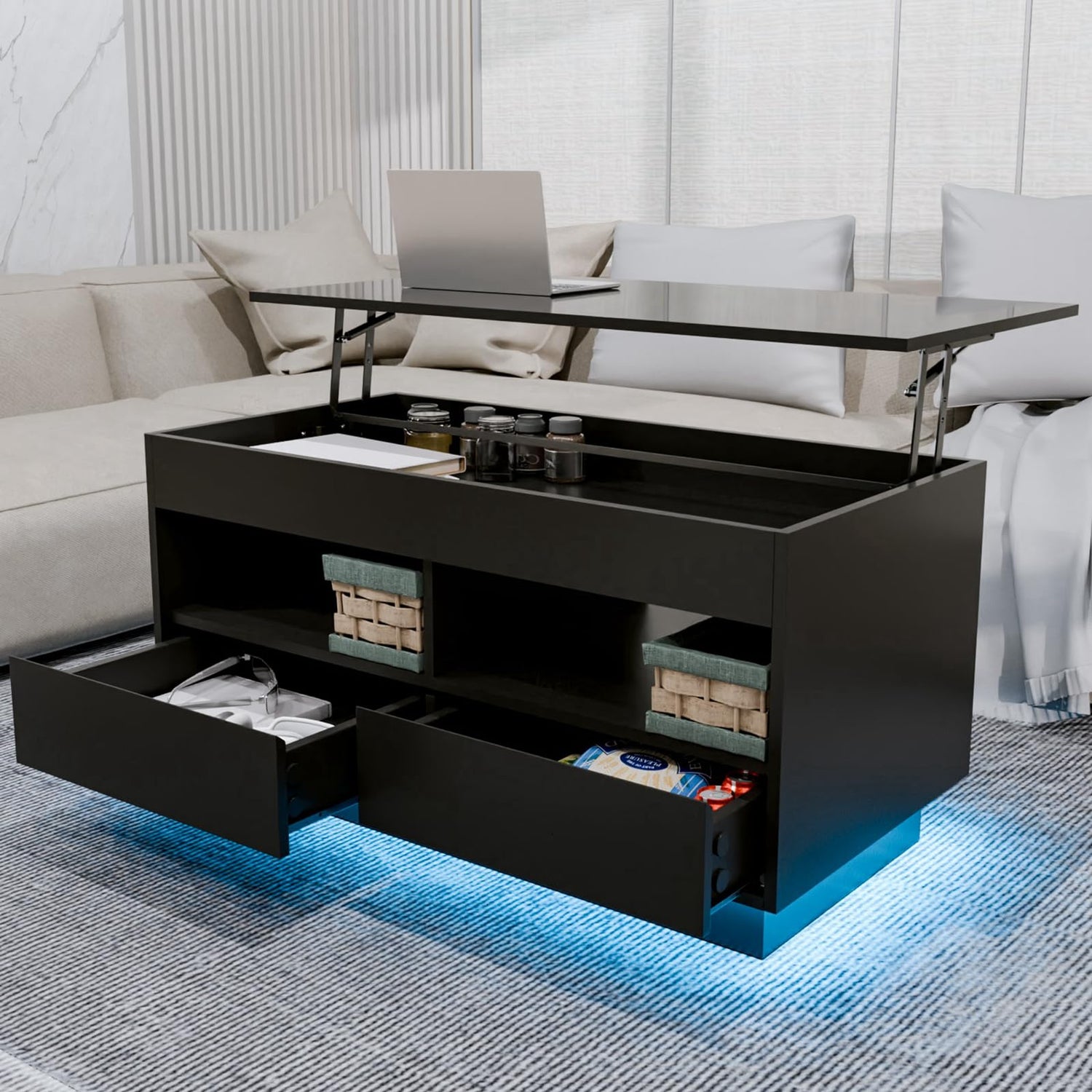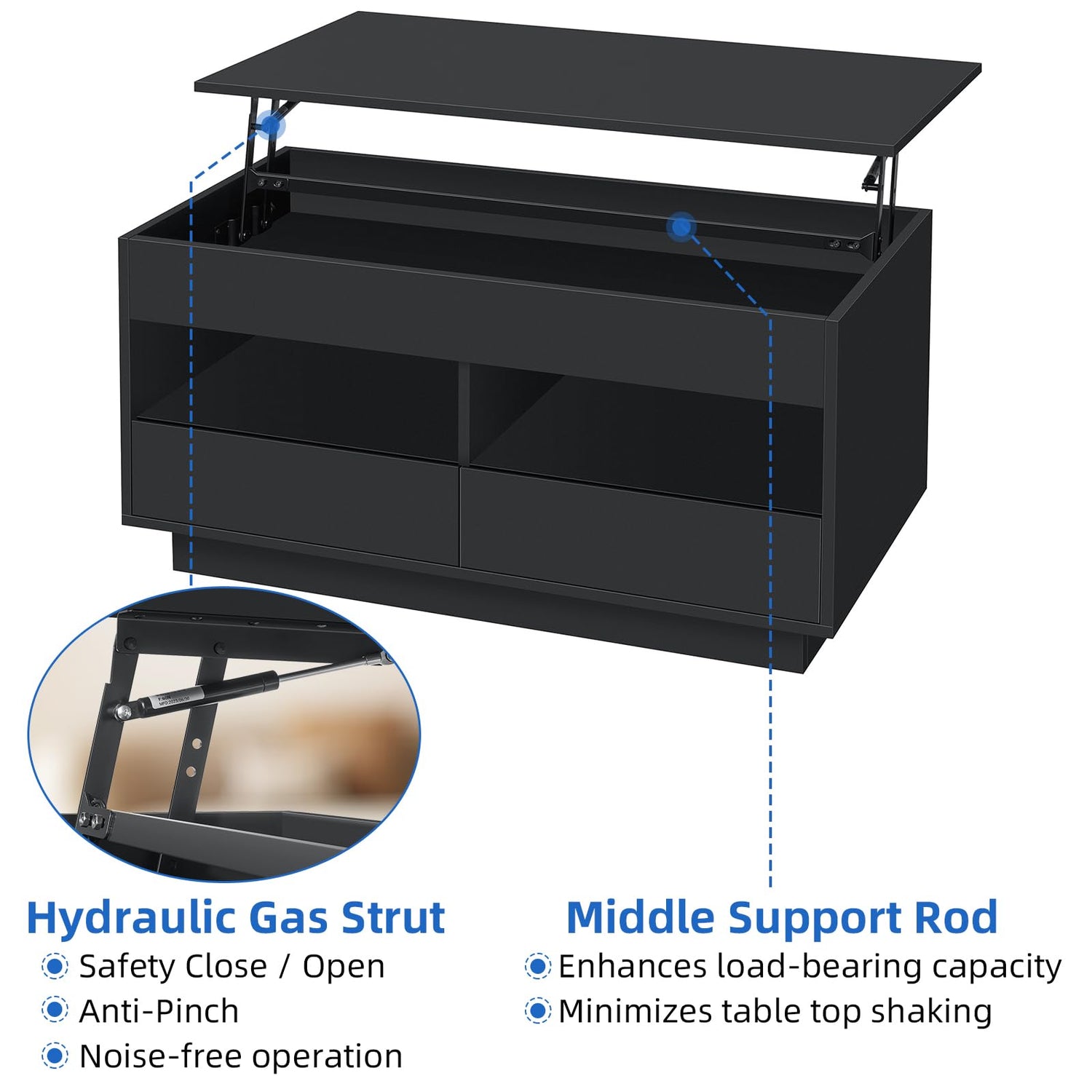 LED Coffee Table for Living Room Lift Top Coffee Tables with Storage Morden High Gloss 4 Tiers Black Tea Table Center Tables Sofa Hidden Compartment & 2 Open Shelve & 2 Drawers