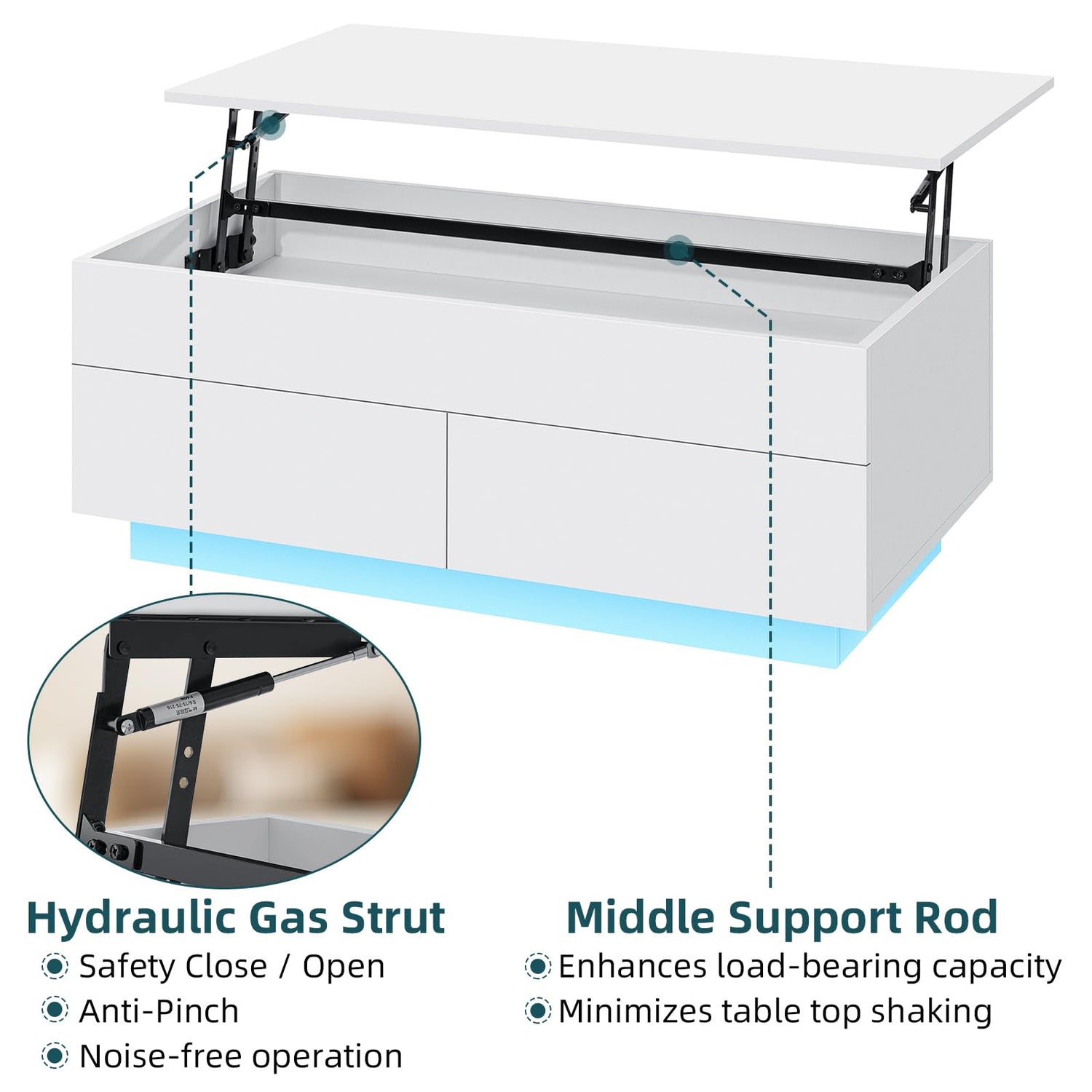 LED Coffee Table for Living Room Lift Top Coffee Tables with Storage Morden High Gloss 4 Tiers Black Tea White Center Tables Sofa Hidden Compartment & 2 Drawers
