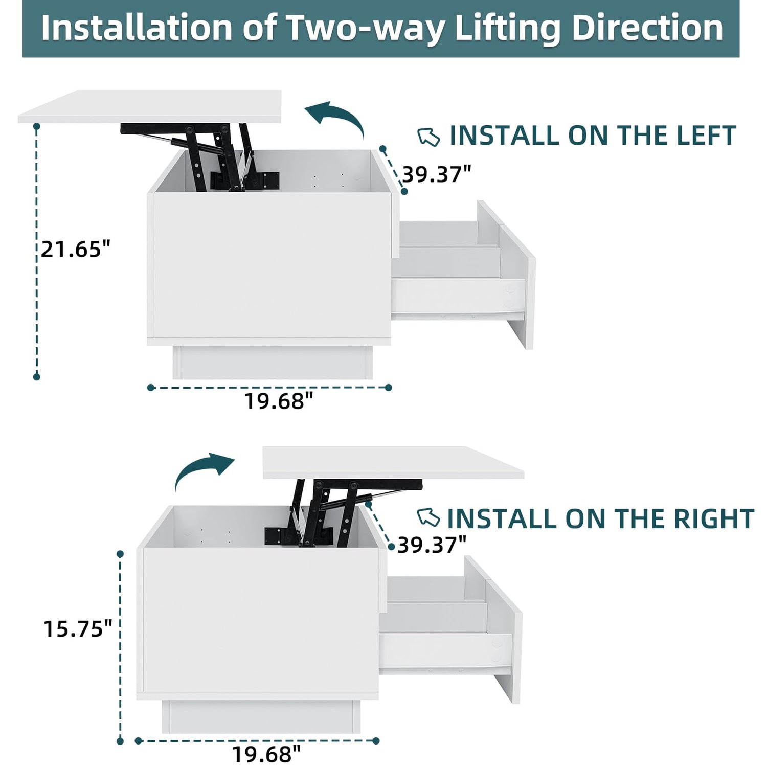- White coffee table has an extended lift top, Built with gas struts for effortless lifting and lowering of the table top ranging from 15.75" to 21.65".