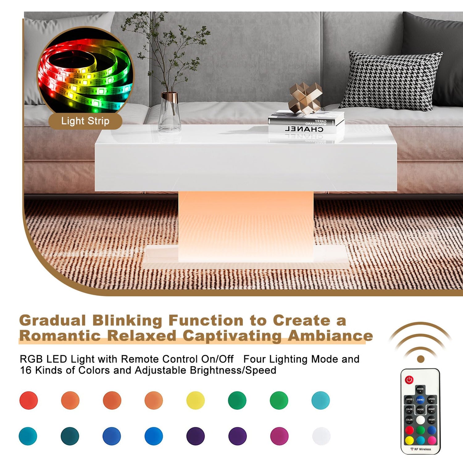 - Coffee Table with 16 Colors LED Lights: This LED living room coffee table is equipped with 16 colors light strip and remote control. You can easily stick it under the coffee table, which is a perfect ornament to create a romantic, relaxed and cheerful atmosphere by changing the color. This LED coffee table includes 16 colors, 4 light patterns with remote ON/OFF and color control.