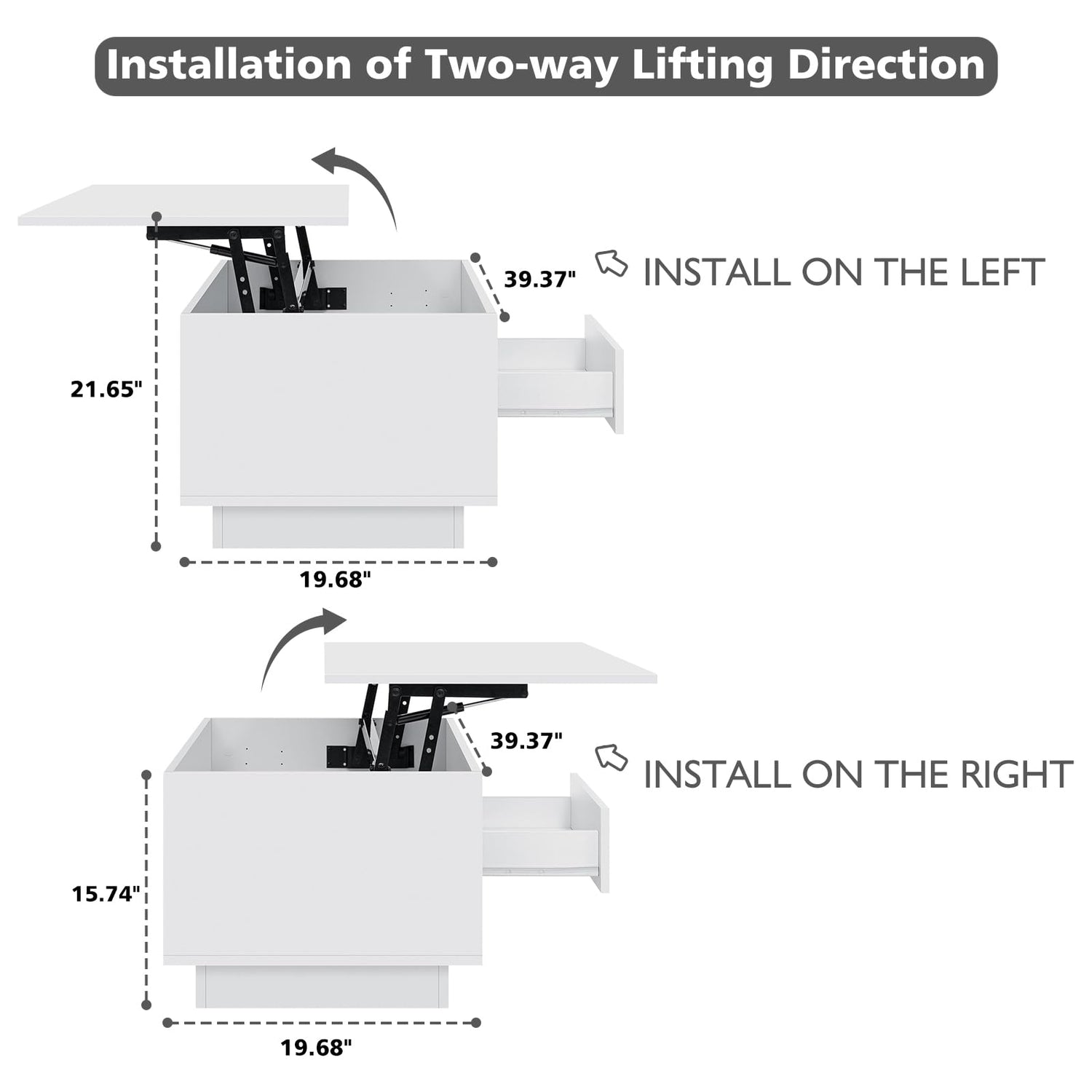- The white lift top coffee table is great for storage. Measuring 40.16''L x 15.75''W x 15.75 - 21.65''H, it has a hidden storage space under the lift - top, an open shelf, and a drawer to keep your things tidy