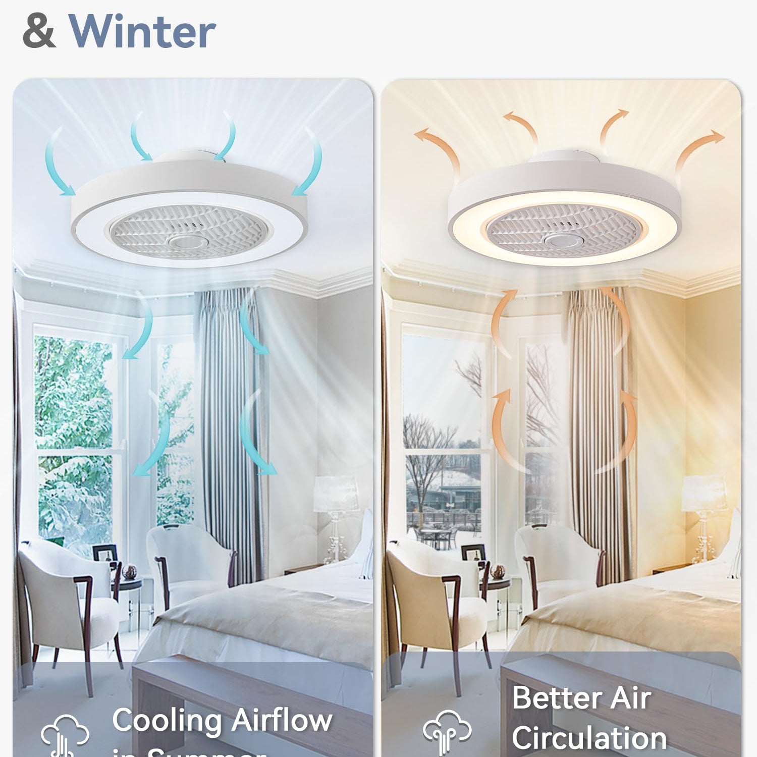 - REMOTE & APP CONTROL: Bladeless led ceiling fan with light through the intelligent remote control (FCC certification) & APP control color temperature (3000-6000K), brightness (0-100%) and achieve forward and reverse function, summer cool, winter circulation of warm air, there is no inability to connect the situation. The flush mount ceiling fan with lights has a memory function, when using the remote control to close and open again color temperature brightness remains unchanged
