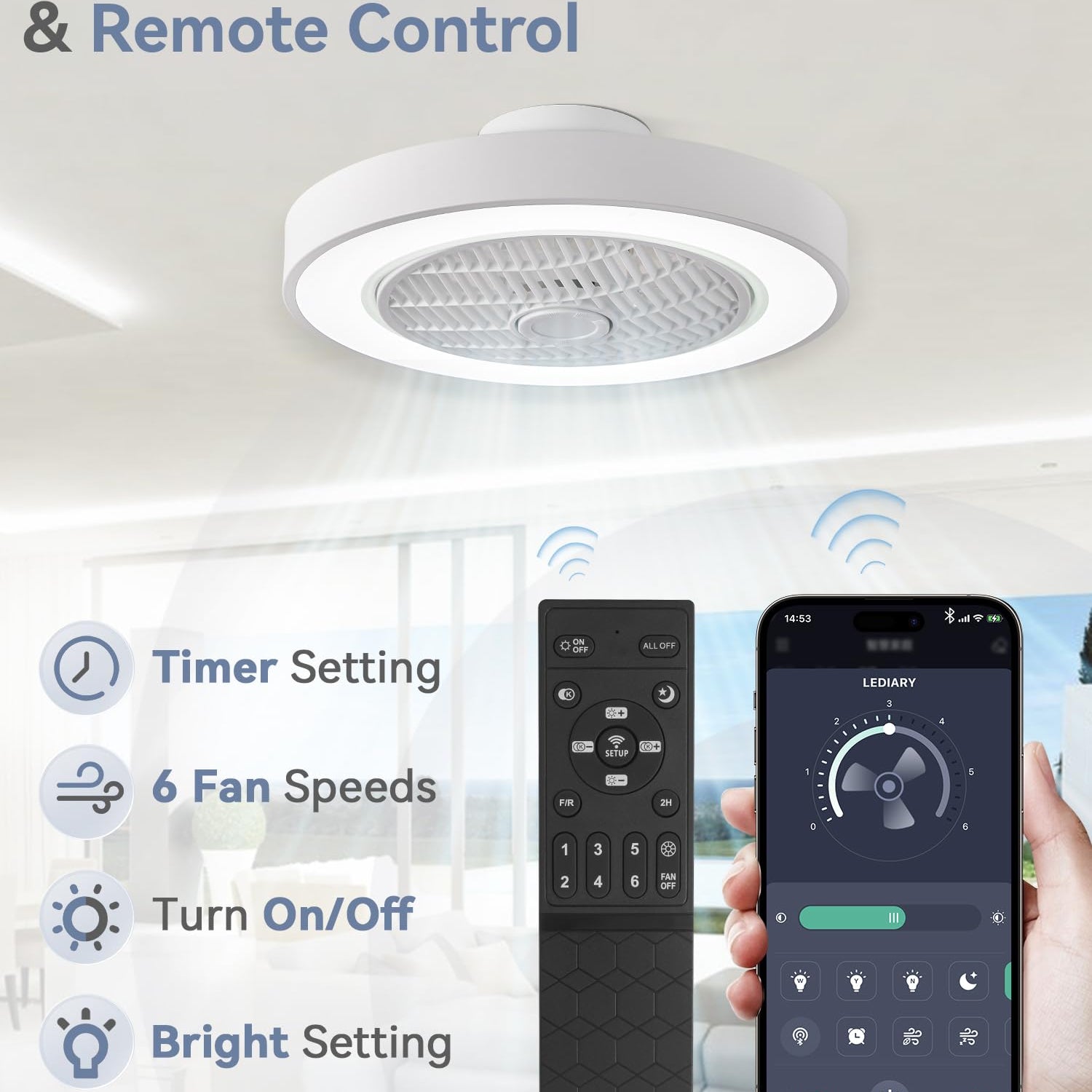 LEDIARY 20 Inch Low Profile Ceiling Fan With Light, Led Bladeless Ceiling Fans, Remote Control Enclosed Flush Mount Ceiling Fan With Timming, 3000-6000K, 6 Wind Speed, 3000LM, 57W-White
