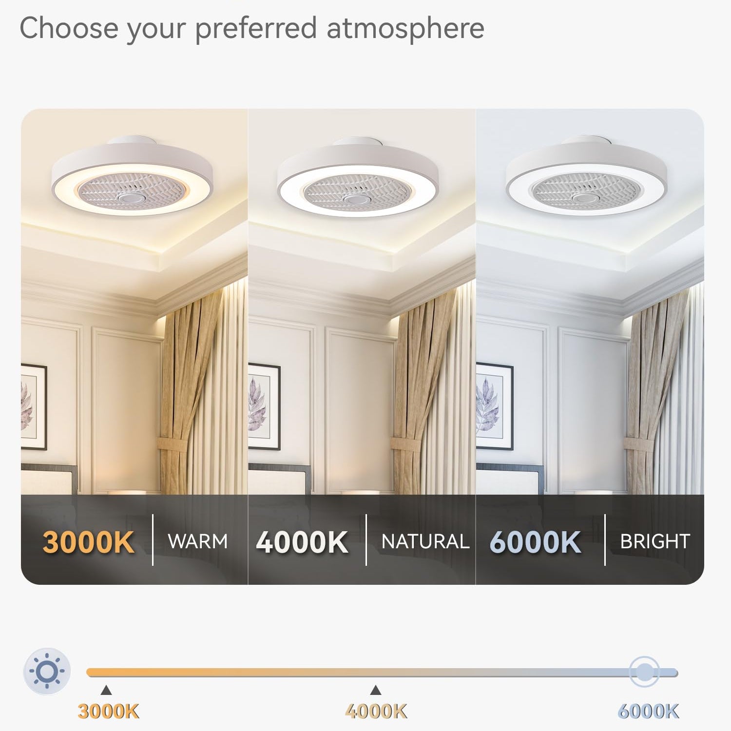 - LED DIMMABLE: Soft led light source does not irritate the eyes, no flash, energy and money saving. Dimmable performance can adjust the bladeless ceiling fan's color temperature and brightness according to demand, creating a bright or warm and other different atmosphere. Suitable for kids room, bedroom, kitchen, living room and other places