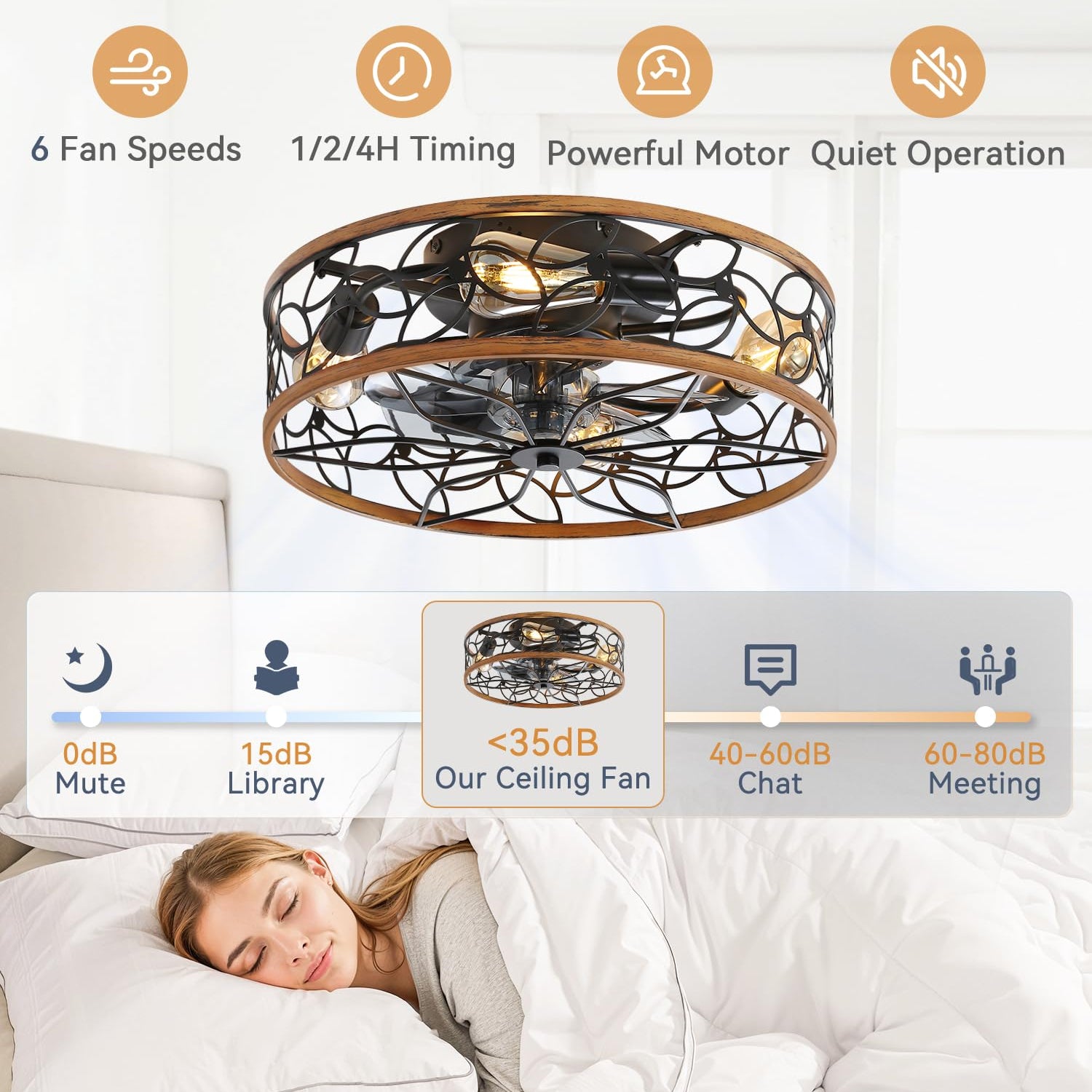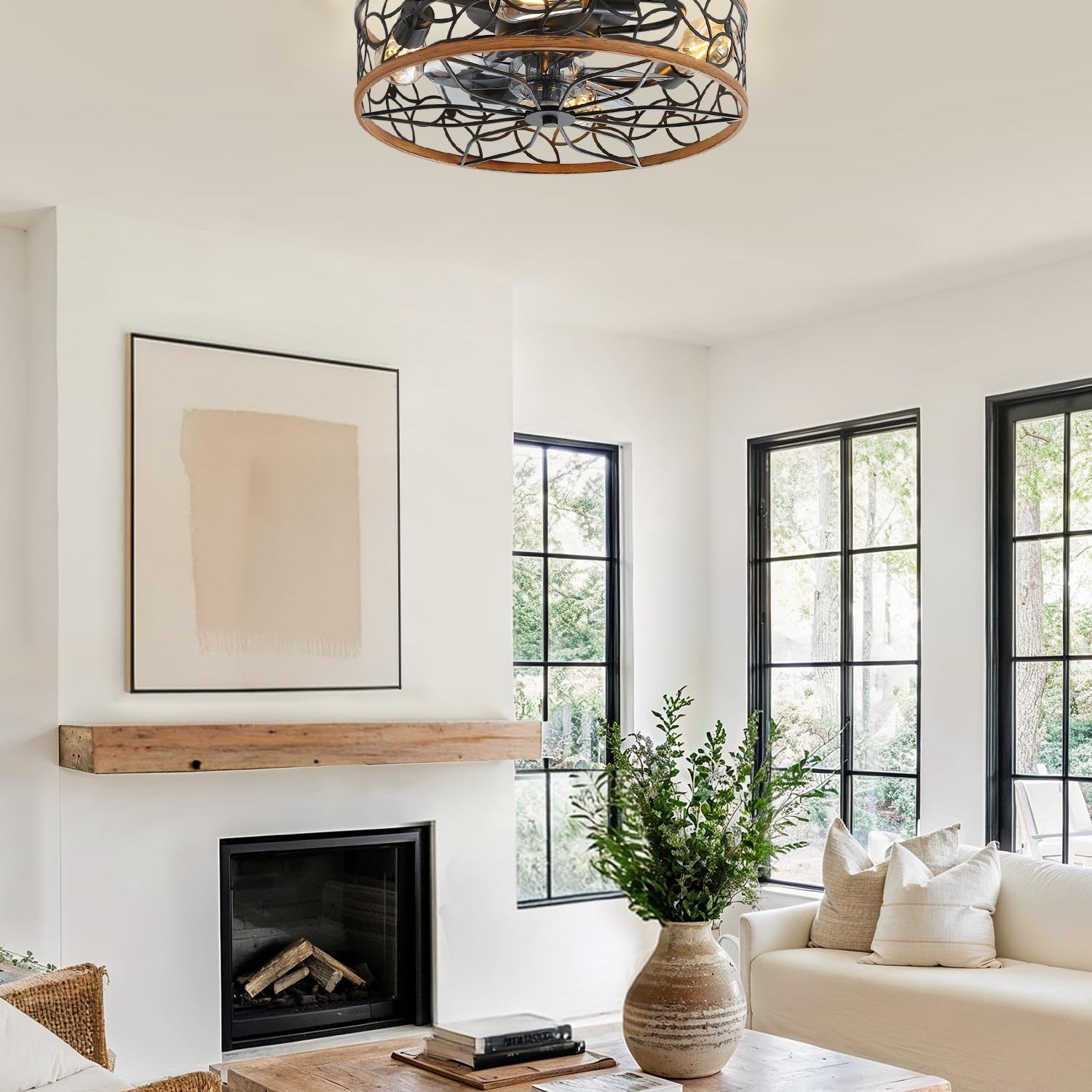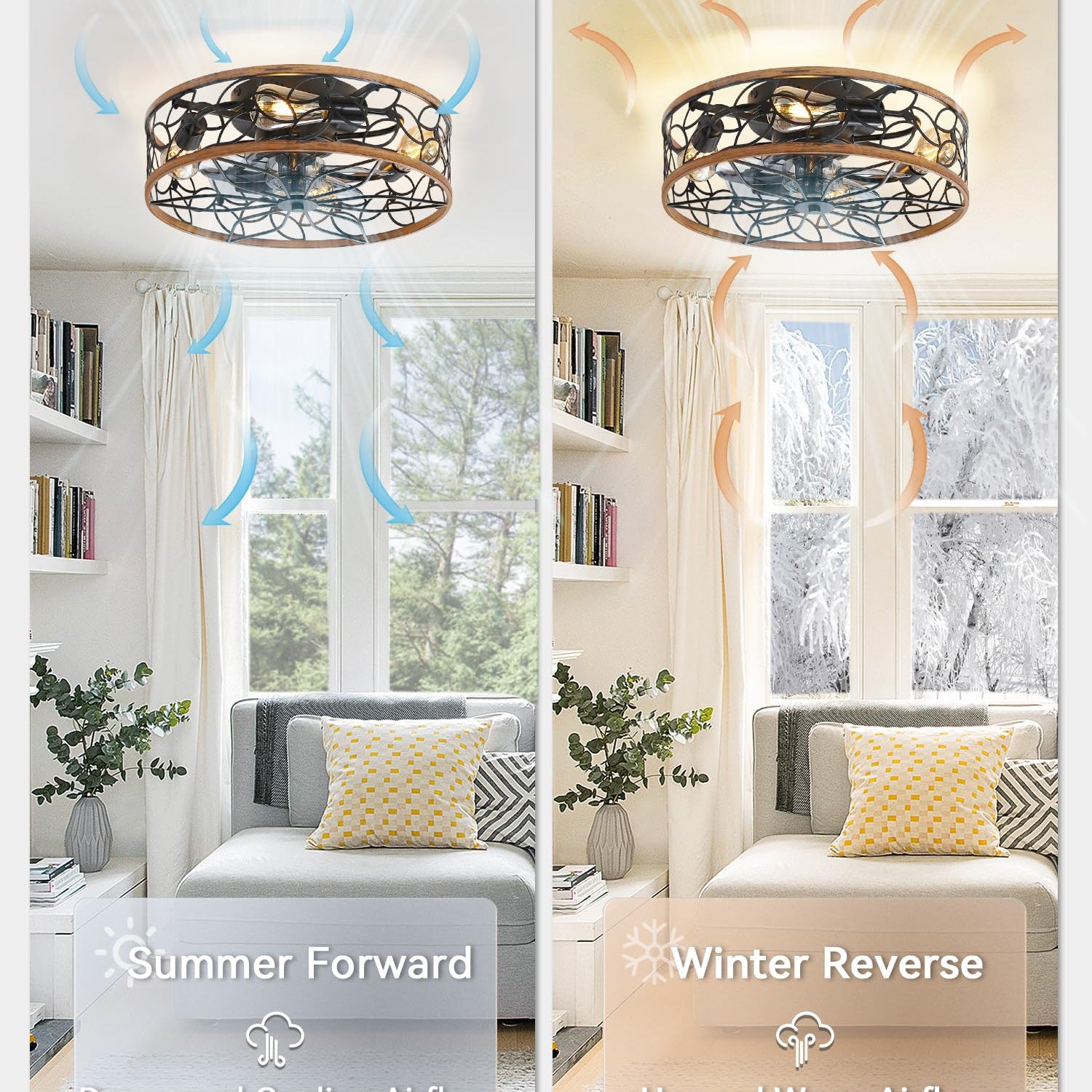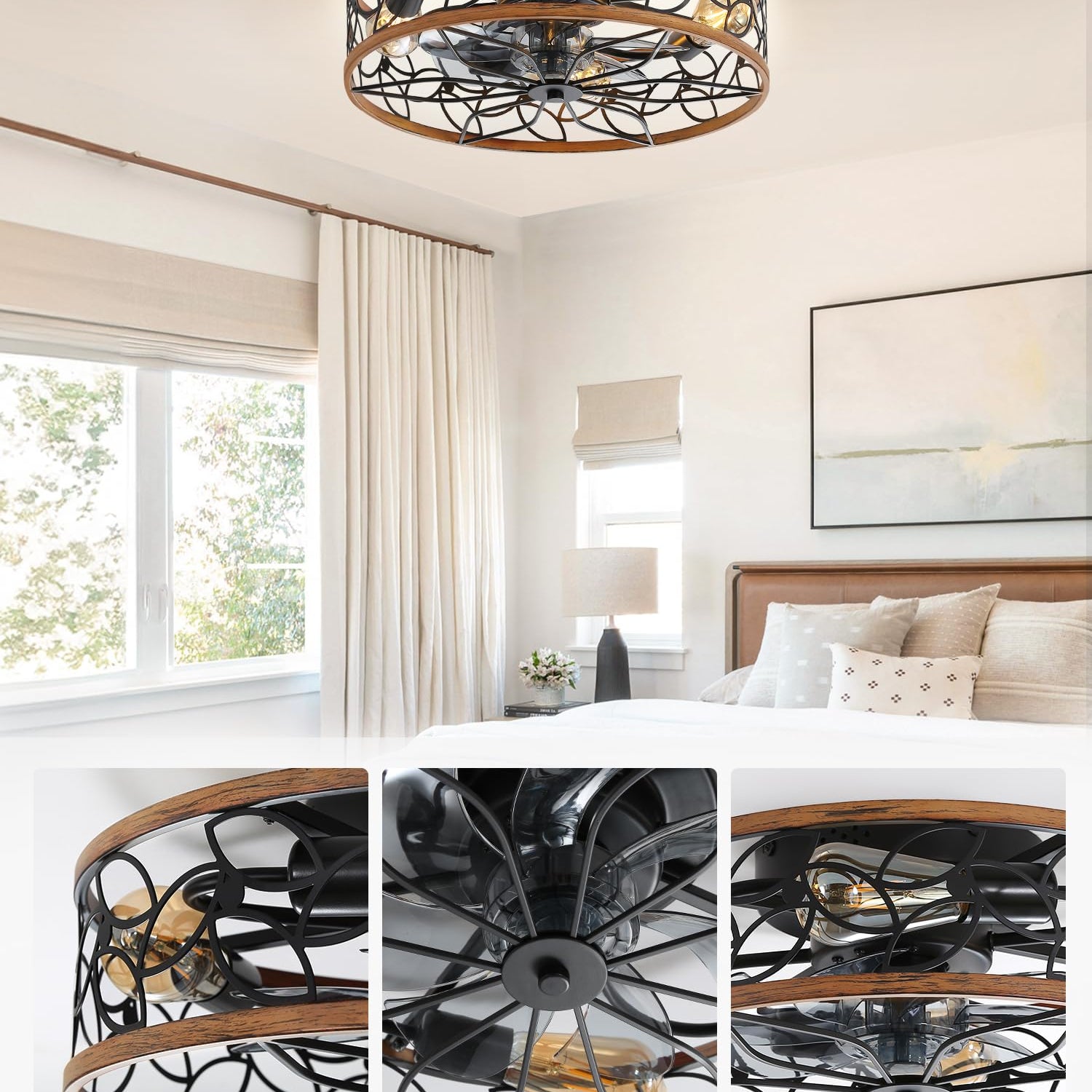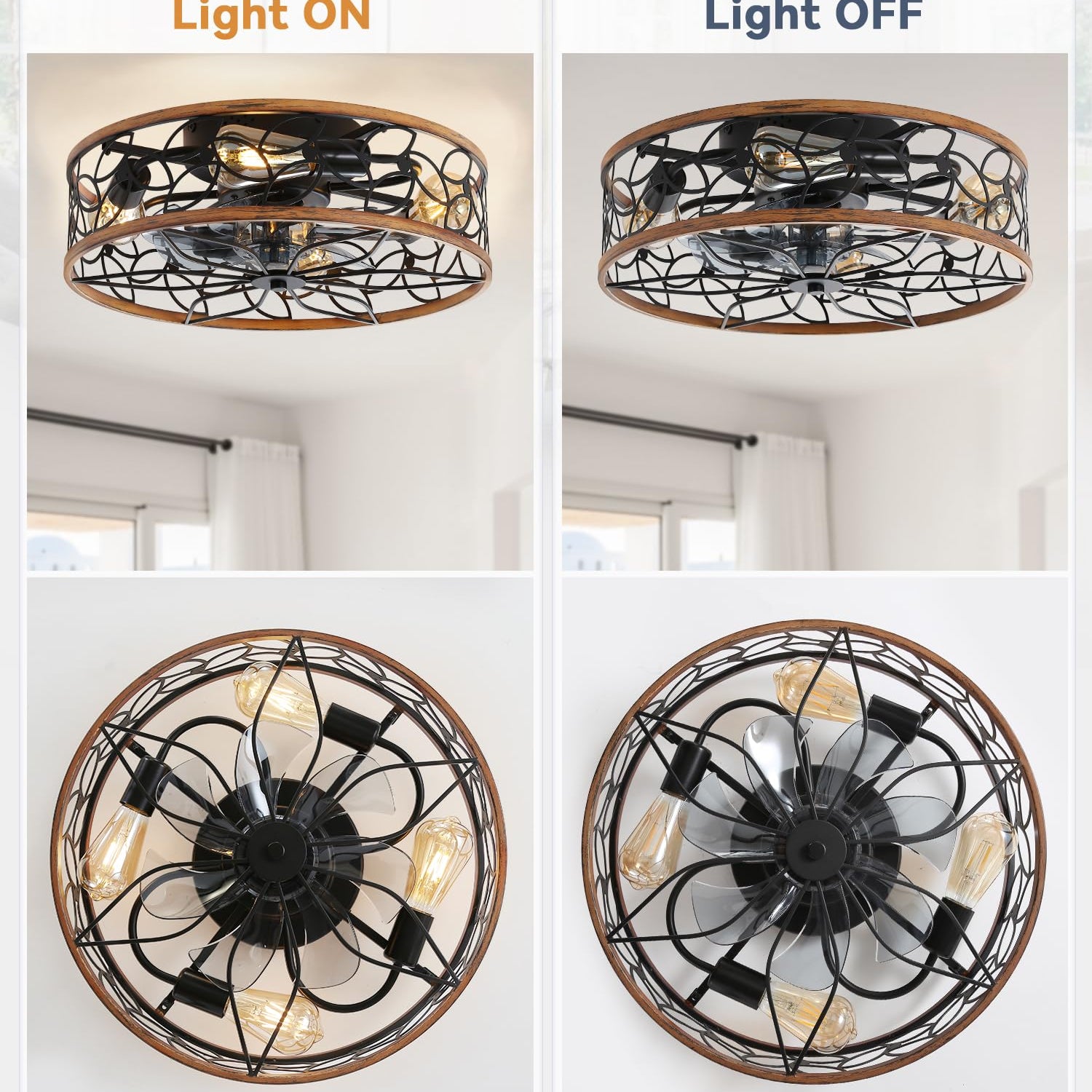 - 【Caged Design】The low profile ceiling fan has excellent coloring process and quality control, which combines practicality and aesthetics. It's designed with the farmhouse and modern style——cage shaped frame, walnut%black painted finish and lacelike pattern, perfectly matching and decorating your home