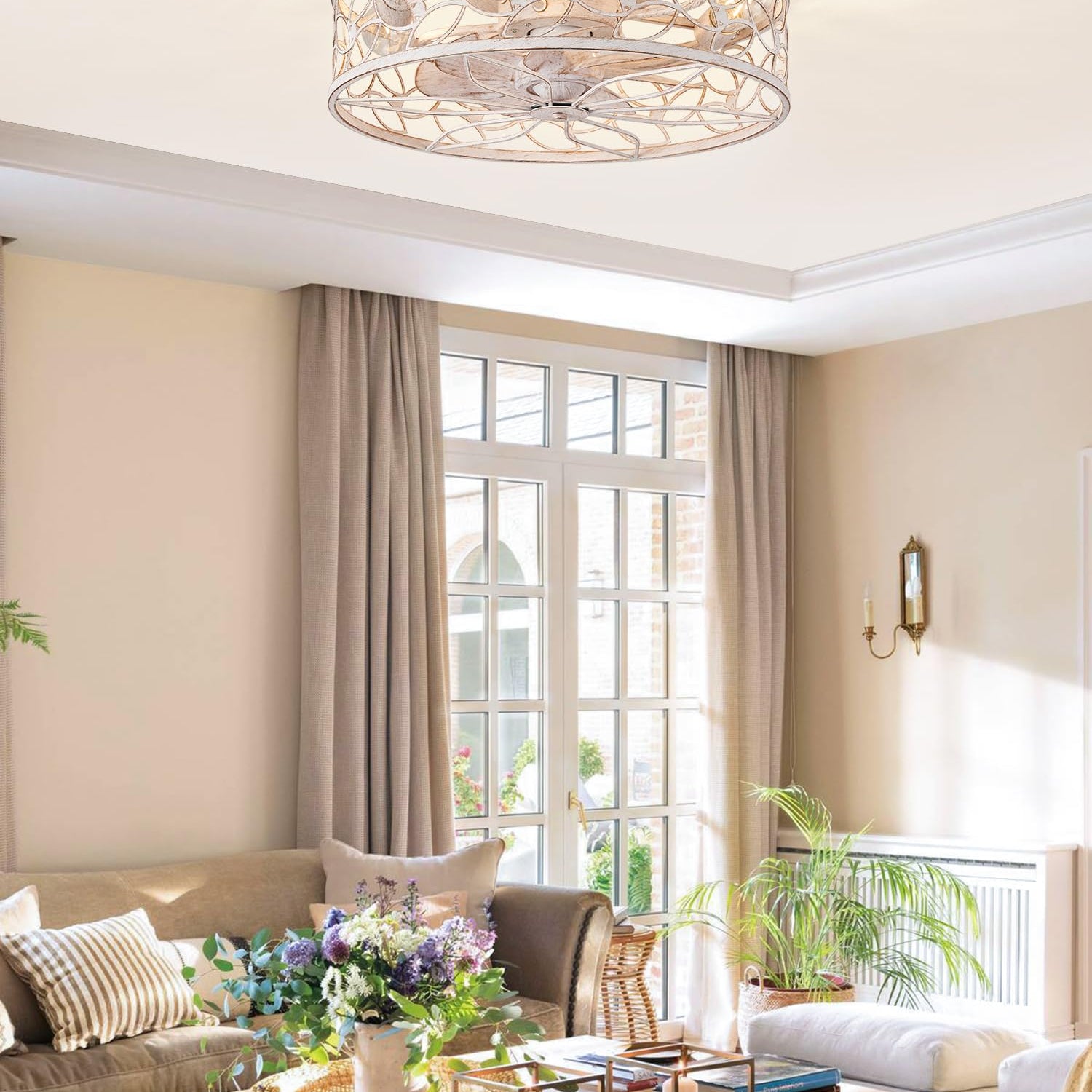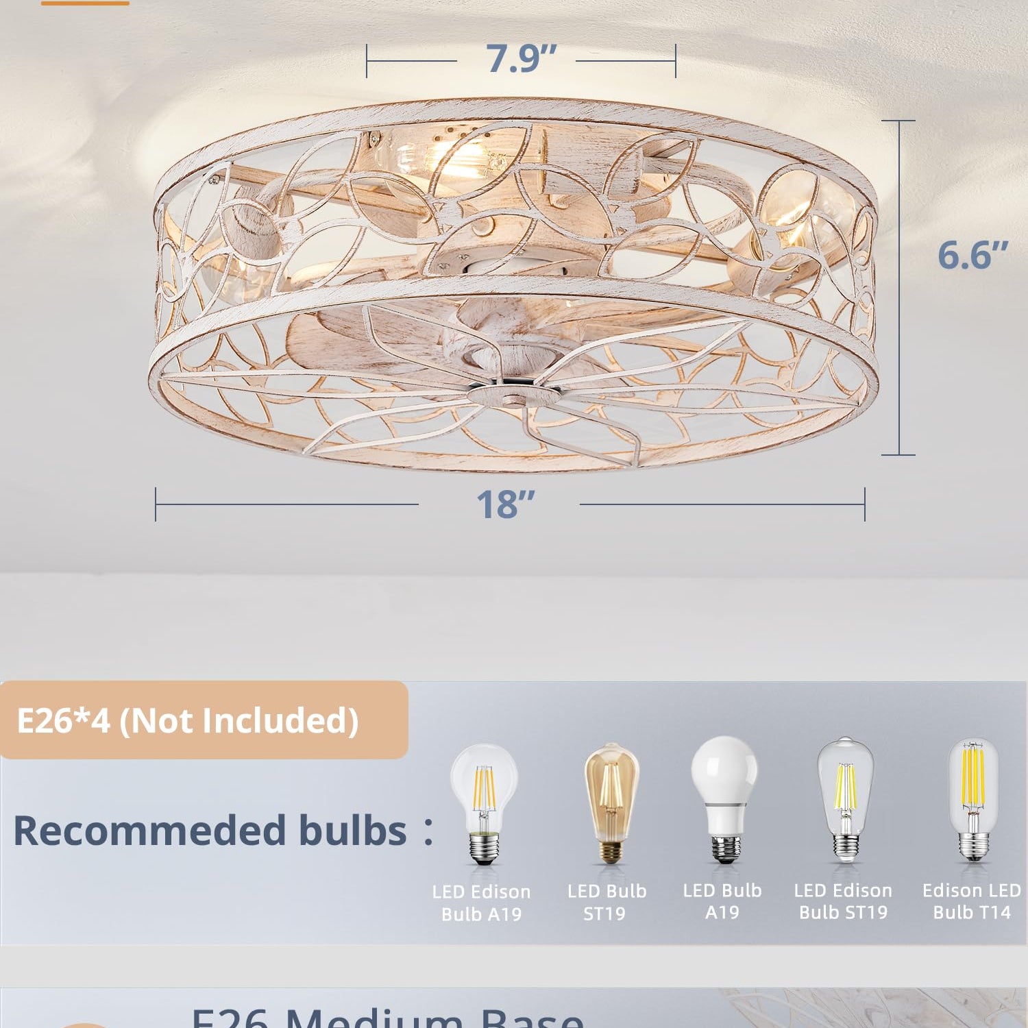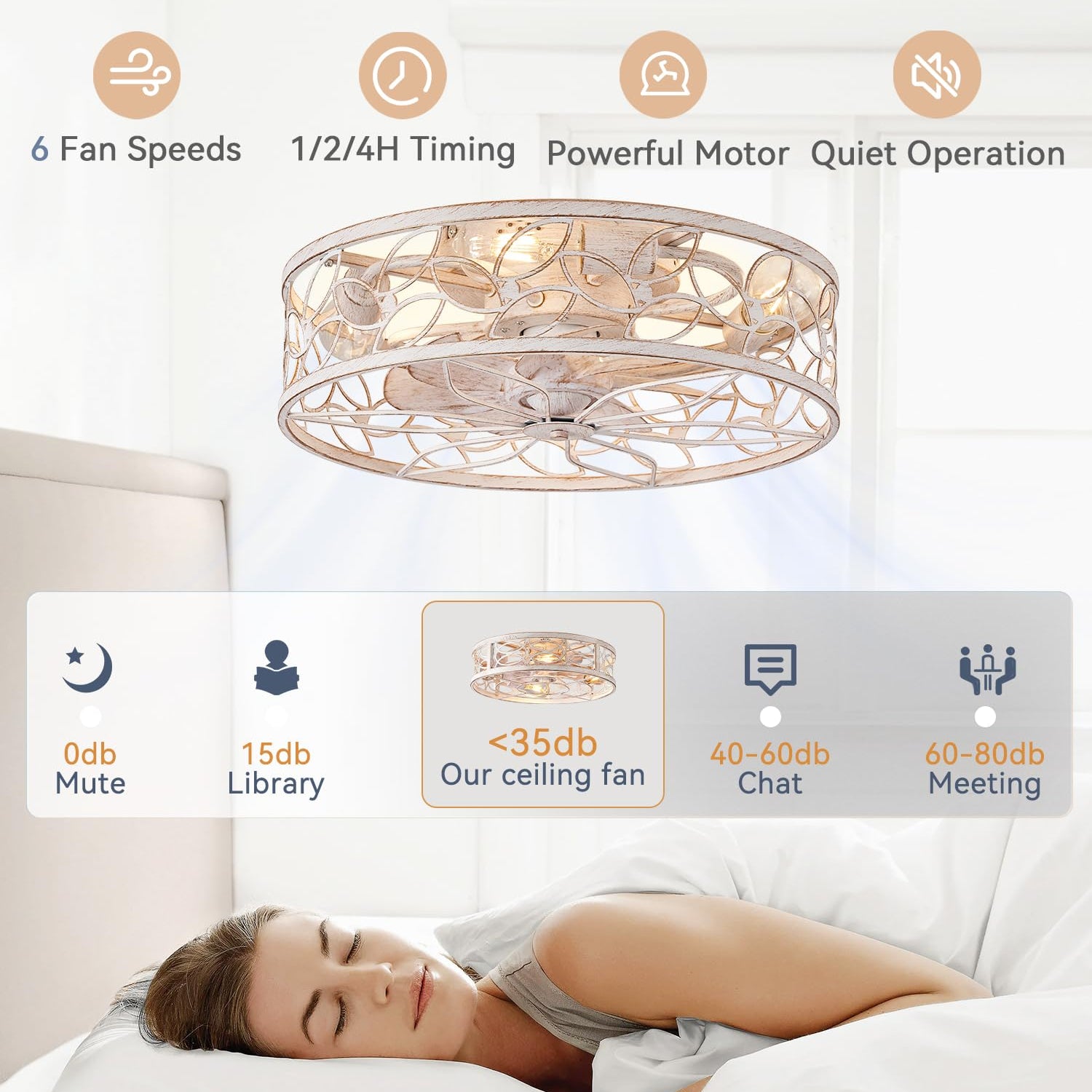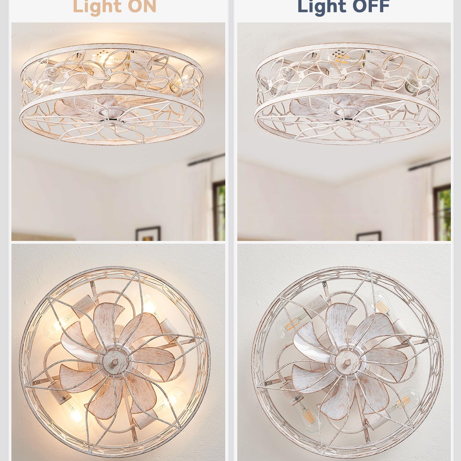 - 【Caged Design】The low profile ceiling fan has excellent coloring process and quality control, which combines practicality and aesthetics. It's designed with the farmhouse and modern style——cage shaped frame, white and golden painted finish and lacelike pattern, perfectly matching and decorating your home.
