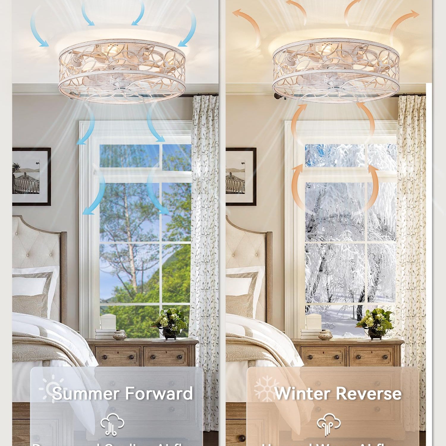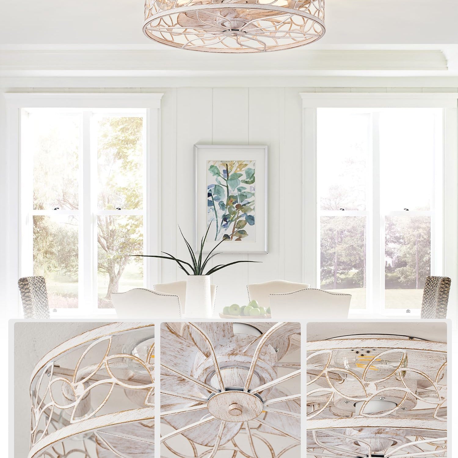 LEDIARY Caged Ceiling Fans with Lights, White Flush Mount Ceiling Fan with Remote, Small Low Profile Bladeless Ceiling Fan Light Fixture for Bedroom, Kitchen, Dining Room-White Gold Color