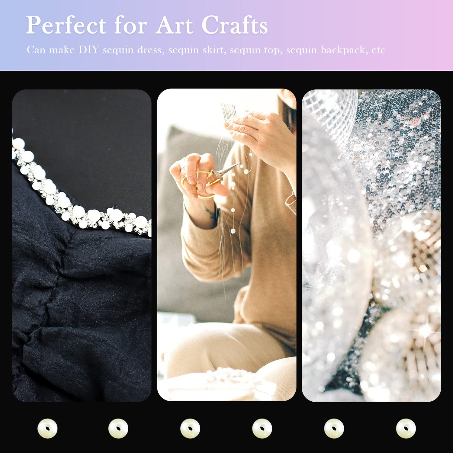 - Sparkling sequins beads can make DIY sequin dress, sequin skirt, sequin top, sequin backpack, sequin boots etc. Perfect for arts, DIY crafts, embellishment, jewelry making, embroidery, applique, sewing, scrapbooks, greeting cards, holiday crafts, etc.