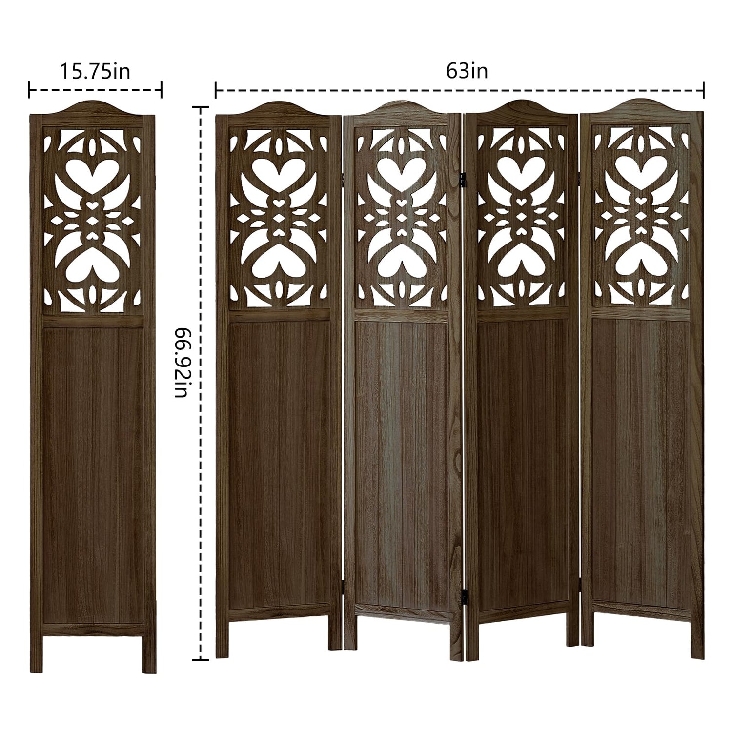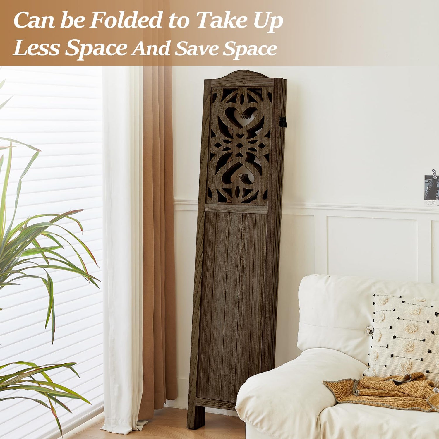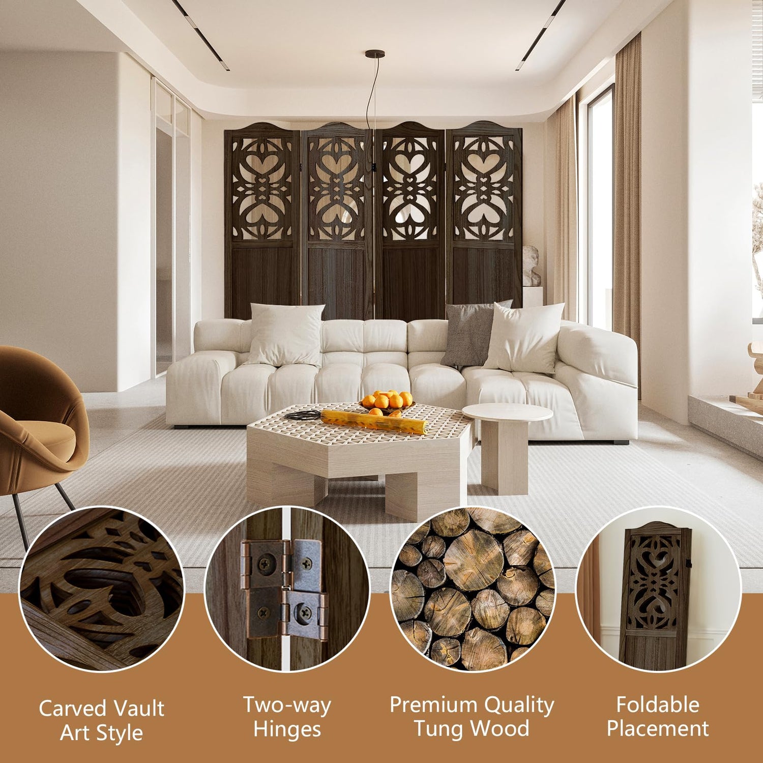 Leesinwing Room Divider, 4 Panel Wood Room Divider Wall, Carved Vault Room Dividers, Rustic Minimalism Room Partition, 5.6Ft Room Dividers and Folding Privacy Screens, Dark Brown