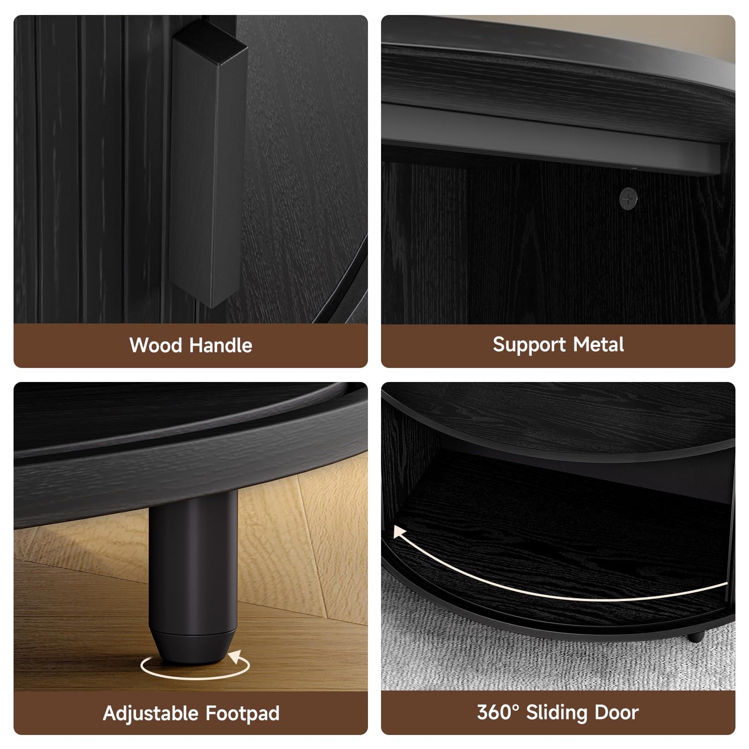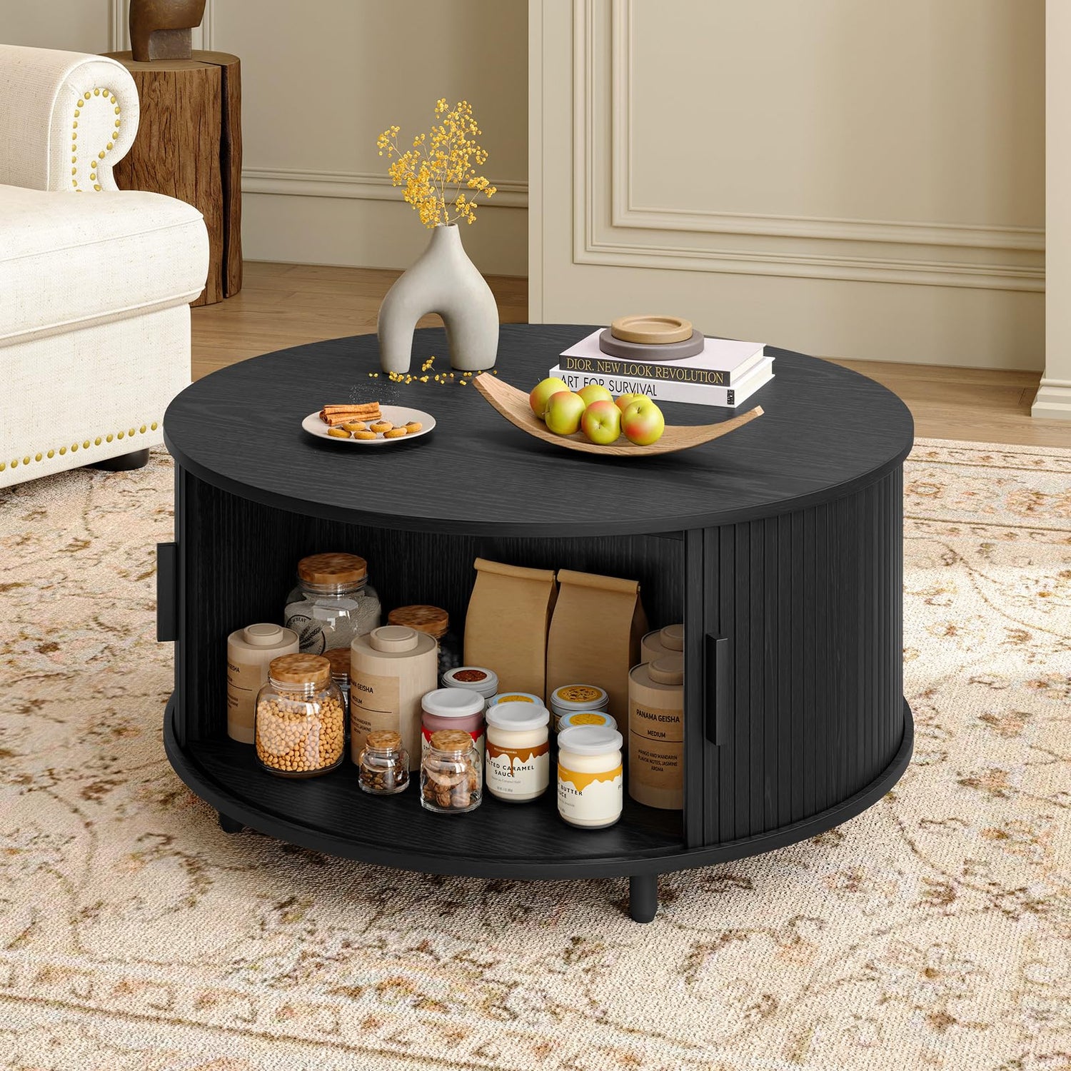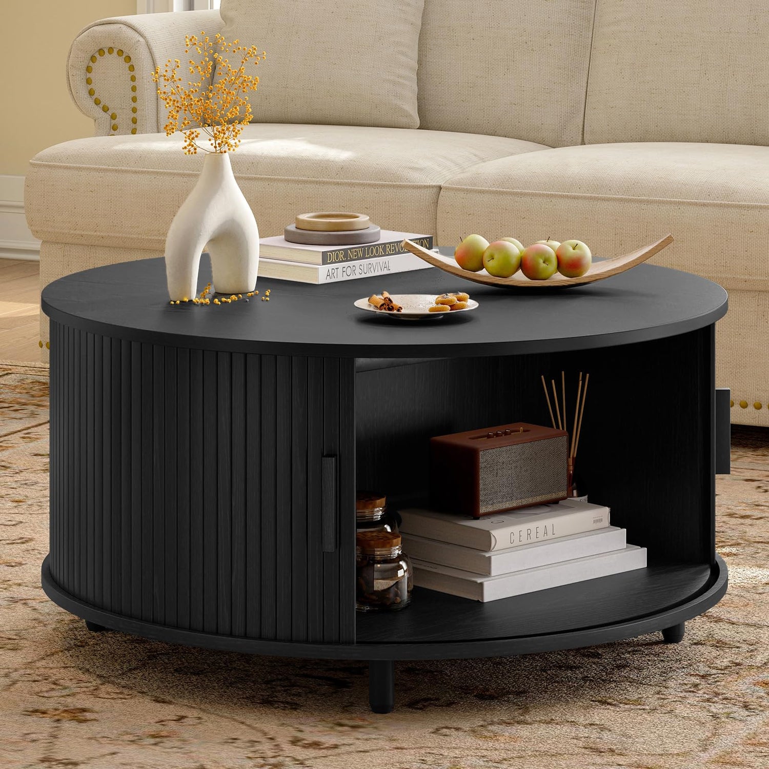 Lefurture 31.5 Inch Round Coffee Table, Mid-Century Modern Coffee Table wtih Storage, Accent Coffee Table with Adjustable Footpads, Center Table with Sliding Doors for Living Room (Black)