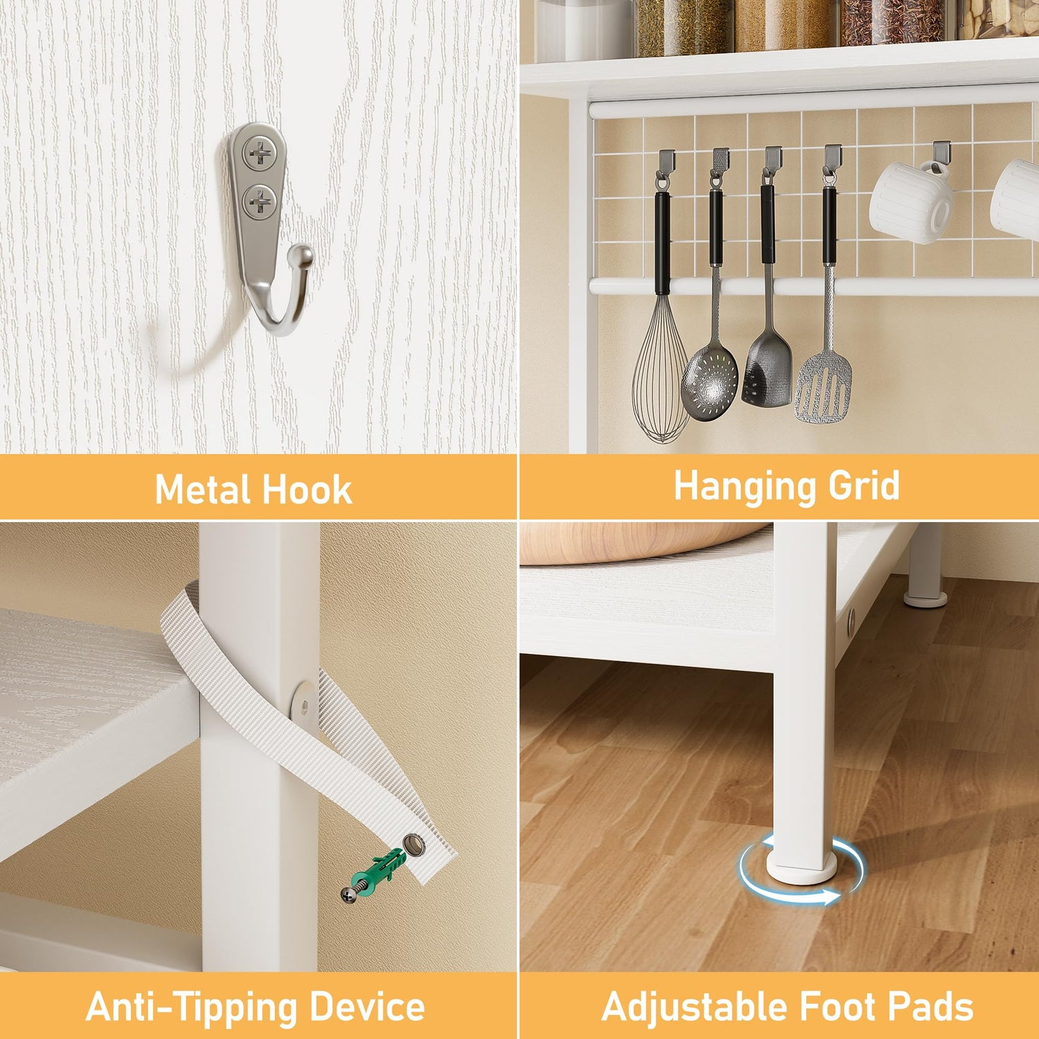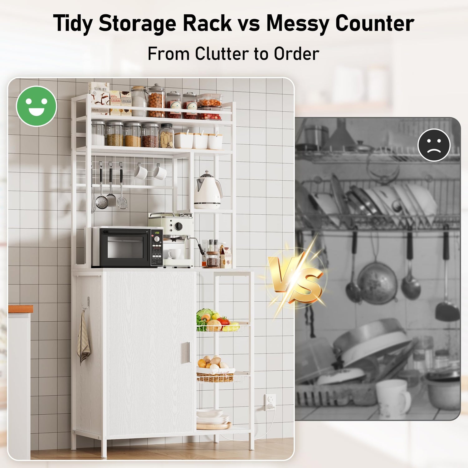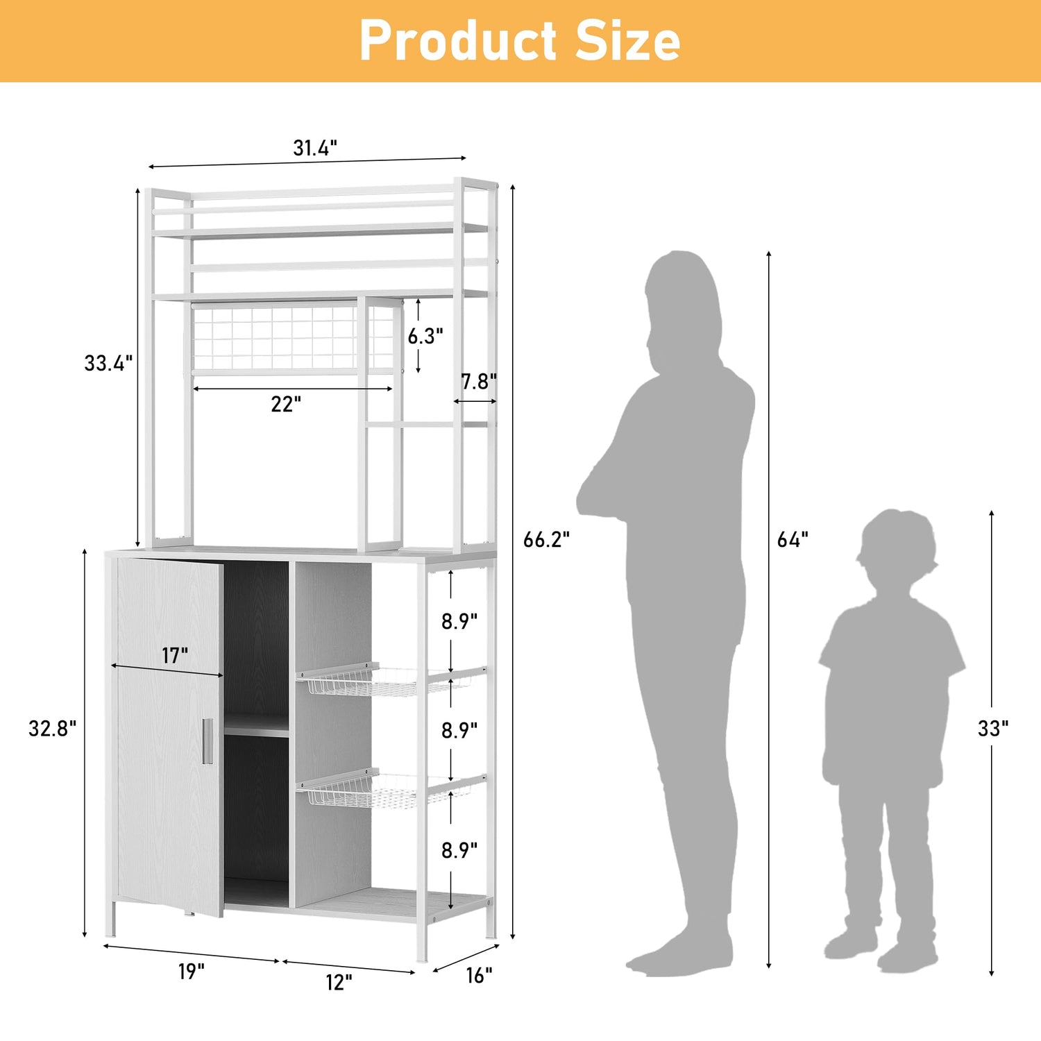 - Large Bakers Rack with Storage Galore——7 tiers of open shelving, two removable wire baskets, and a spacious cabinet make this kitchen bakers rack with storage perfect for organizing cookware, spices, and small appliances.