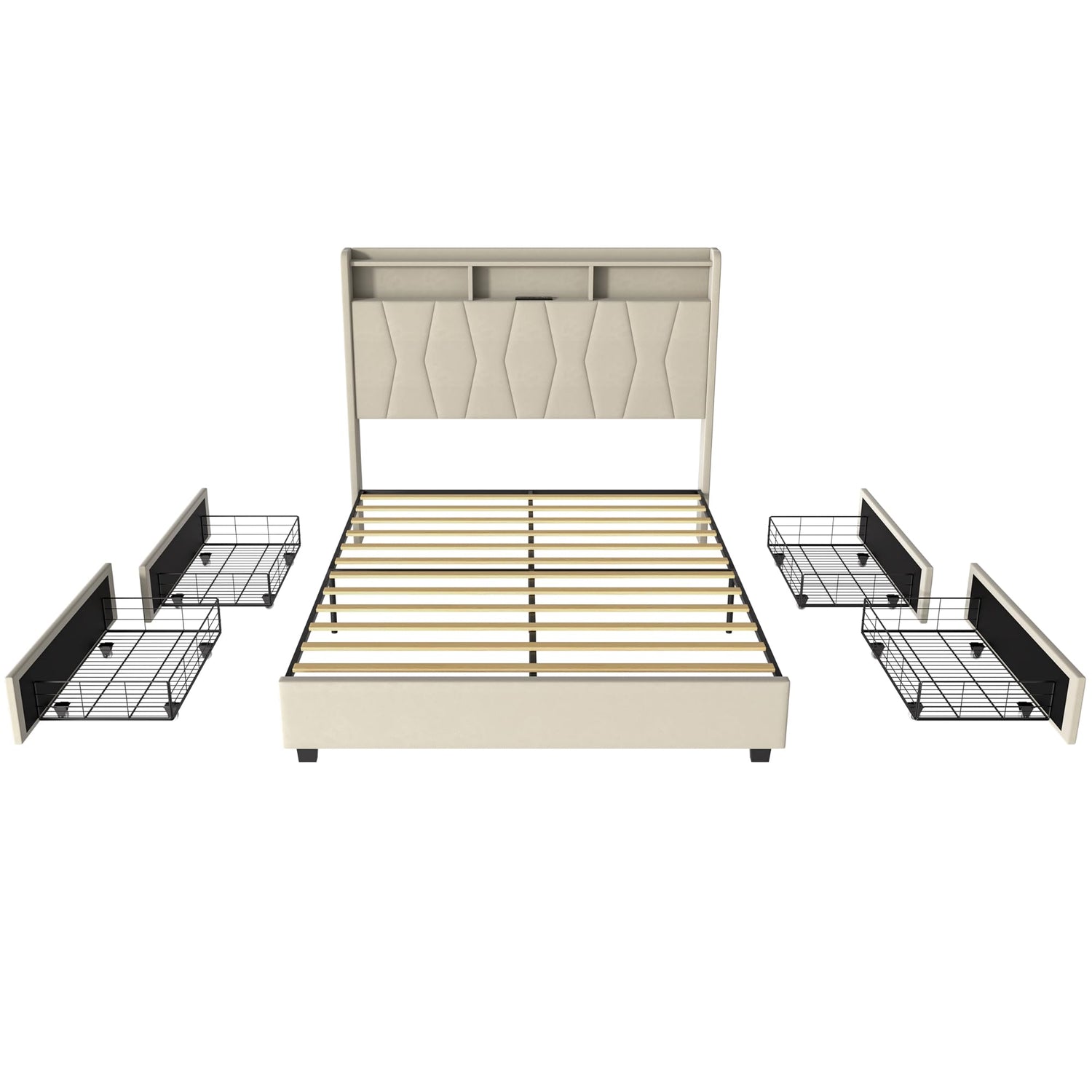 LegacyAmerhome Queen Bed Frame, Velvet Upholstered LED Platform Bed with Headboard Storage, Queen Bed Built-in Charging Station with 4 Drawers, Wood Slat Support, No Box Spring Needed, Beige