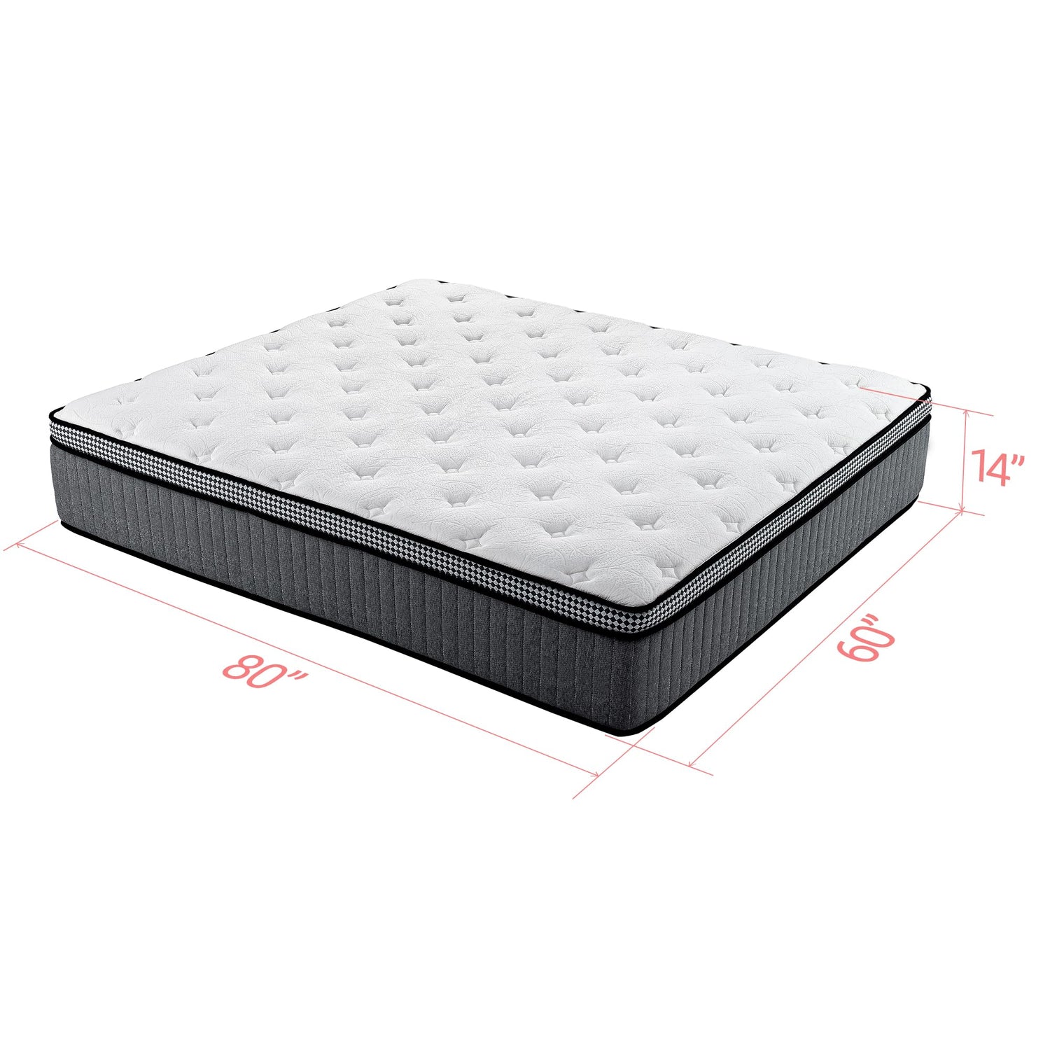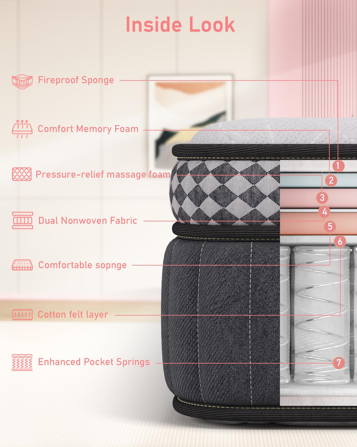 - 【Hybrid Mattress Queen—Tailored Support】14 inch queen size mattress features hundreds of individually pocketed springs with varying firmness levels, providing targeted and even support across key areas of your body.The queen size mattress also minimizes noise and motion transfer, ensuring that both partners can enjoy a peaceful night's sleep.