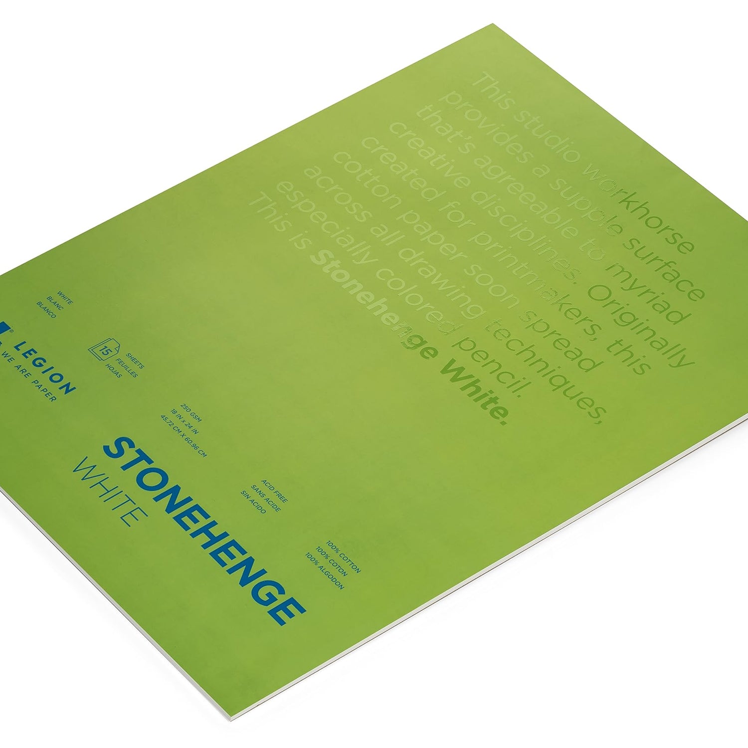 Details: This Stonehenge pad measures 18 by 14 inches and includes 15 sheets of pure white 100 percent cotton deckled paper that is acid-free and pH neutral. Designed for students and professionals alike this versatile paper is suitable for printmaking, etching, silkscreen, pencil, pastel, watercolor and various other fine art applications. Stonehenge is a high quality, archival paper that is cost efficient. Made in the USA. 250 gsm.