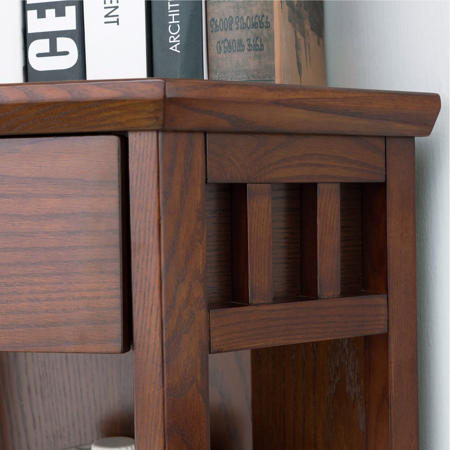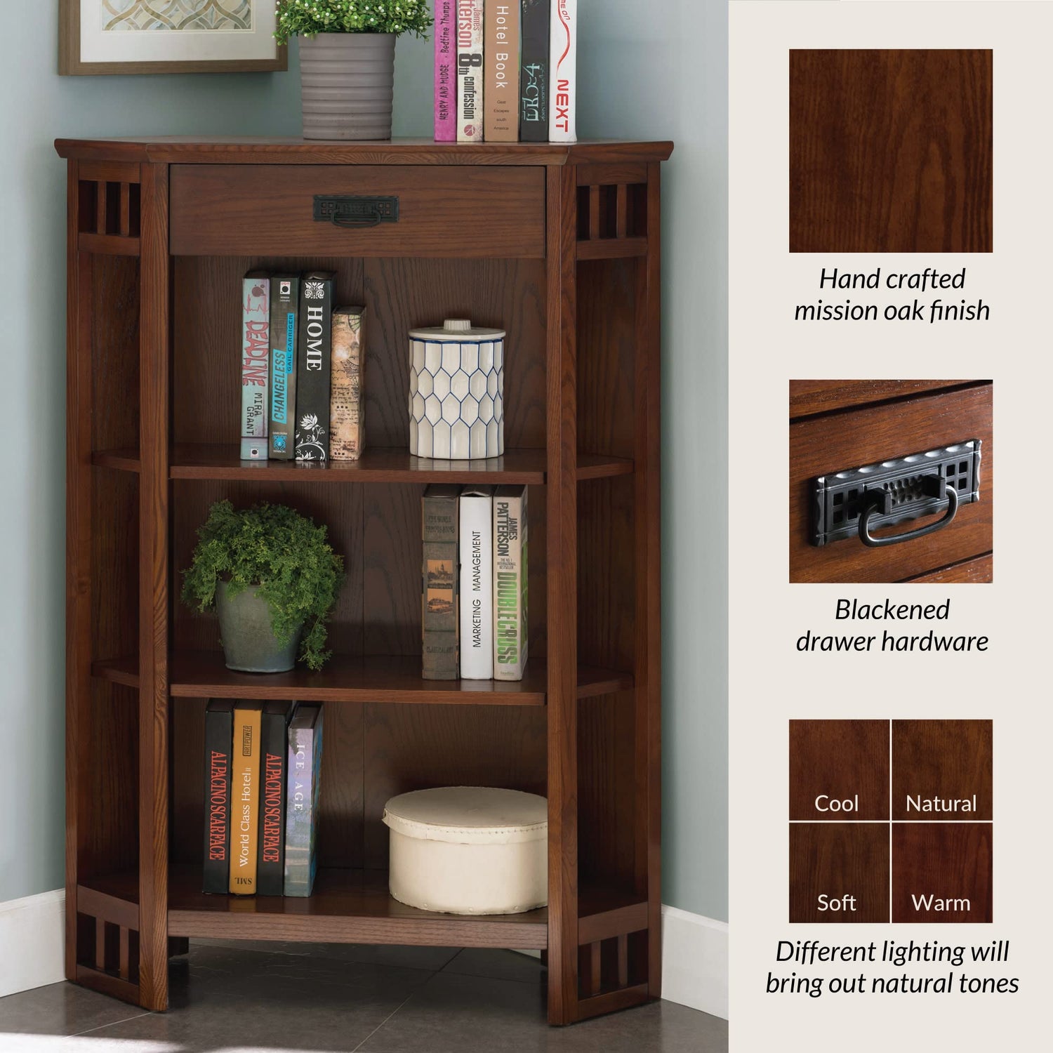 Details: The Leick Home Mission Corner Bookcase offers compact layers of furnishing possibilities. This tall wooden bookcase has tucked away drawer storage, prominent mantel height top surface, and three adjustable shelves to hold anything that suits you. A clever corner design settles back into the corner and reclaims valuable floor space. A rich, mission finish embellishes solid oak and oak veneers in this authentic slatted mission design. The solid wood drawer box opens completely on ball-bearing roller glides and includes an anti-tipping safety device. This corner bookcase will be a great functional addition to your entryway, living room, home office, and bedroom. Designed and manufactured by Leick Home, the trusted source for quality home furnishings for every taste and budget.