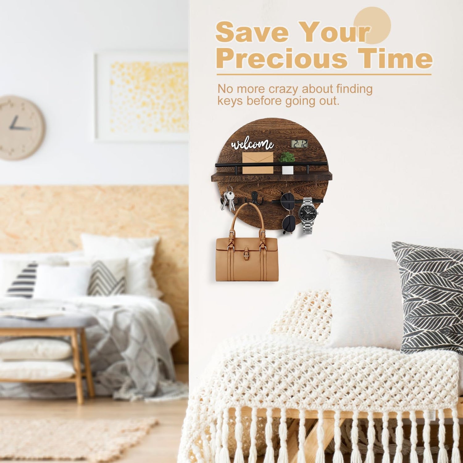 LEIRUOTM Key Holder for Wall, Key and Mail Holder Organizer with - Key Holder Wall Mount - Round Wooden Rustic Home Decor for Entryway, Mudroom, Hallway, Kitchen Office (Brown)