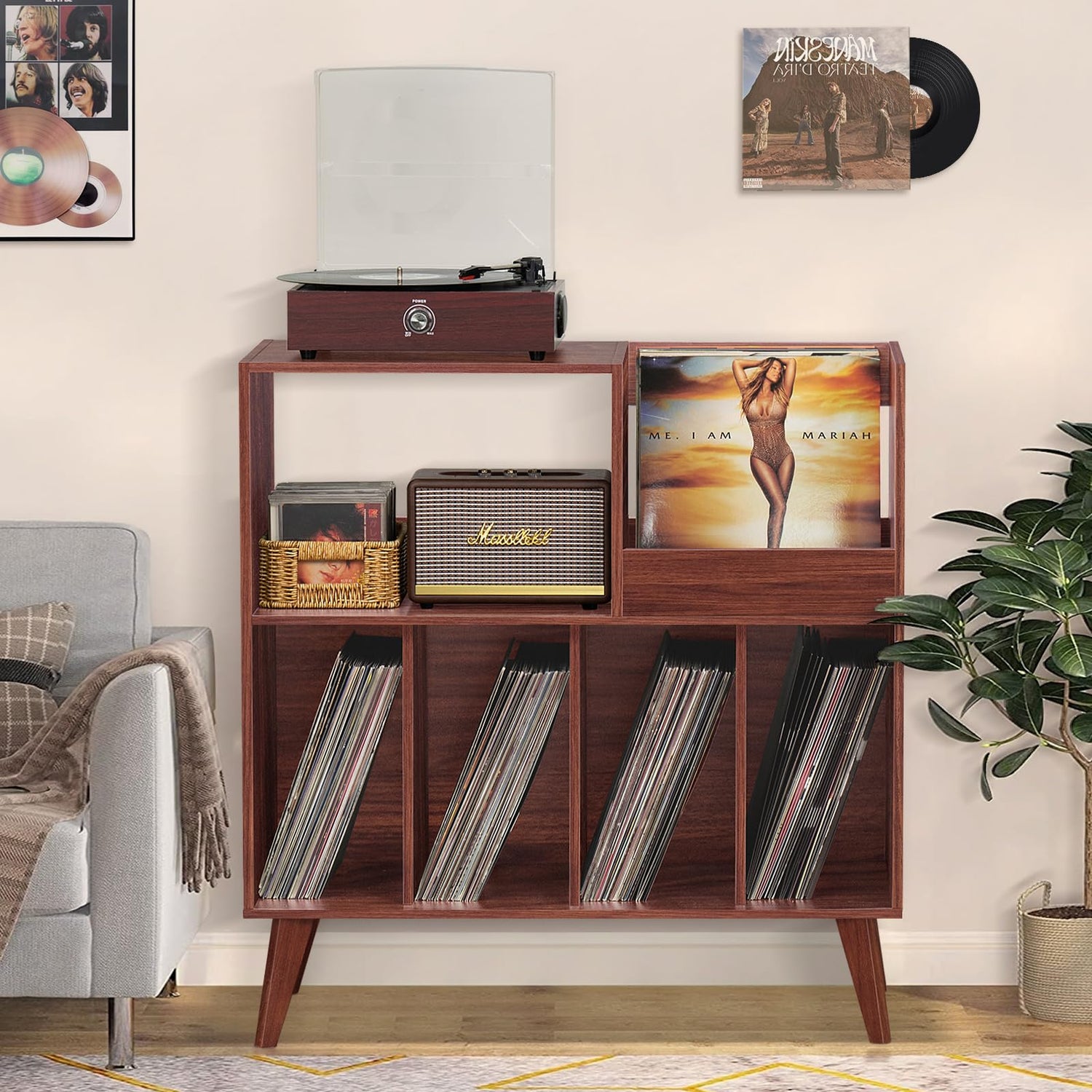 - đ”ăEasy storage for 300 recordsă This ultra-large capacity record player holder can easily store more than 300 vinyl records, with 4 broad partitions to store different styles of vinyl records. We have also designed a unique open display area for the vinyl records in this record player table for you to easily select the vinyl record you want.