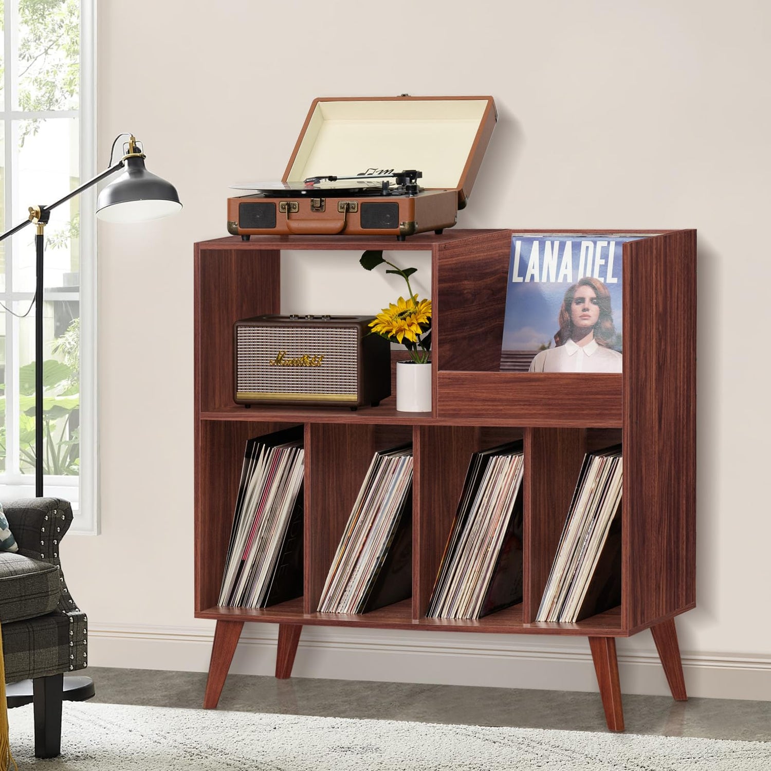 Details: Large vinyl record storage cabinetThis large vinyl record player stand has 4 large partitions and a vinyl display area, and a storage area for external audio equipment.