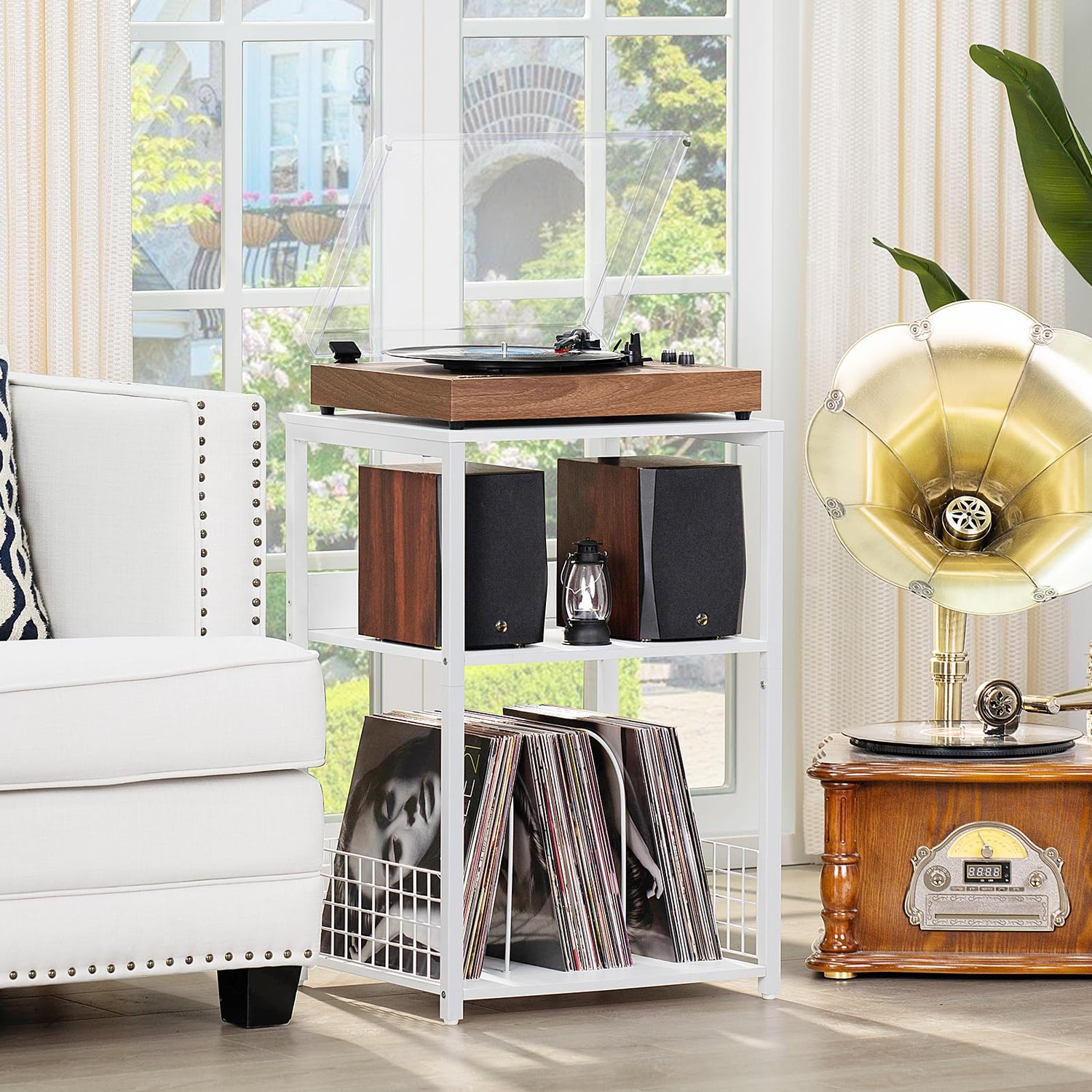 - [ Record Player Stand ] The white rustic record player stand has 3 tiers. The spacious tabletop is suitable for multiple sized record players. The 2nd and 3rd open storage shelves can hold all kinds of records and media essentials, storing up to 130 albums. The categorized storage of vinyl records holder combines art and practicality, filling your room with artistic atmosphere and keeping neatness.