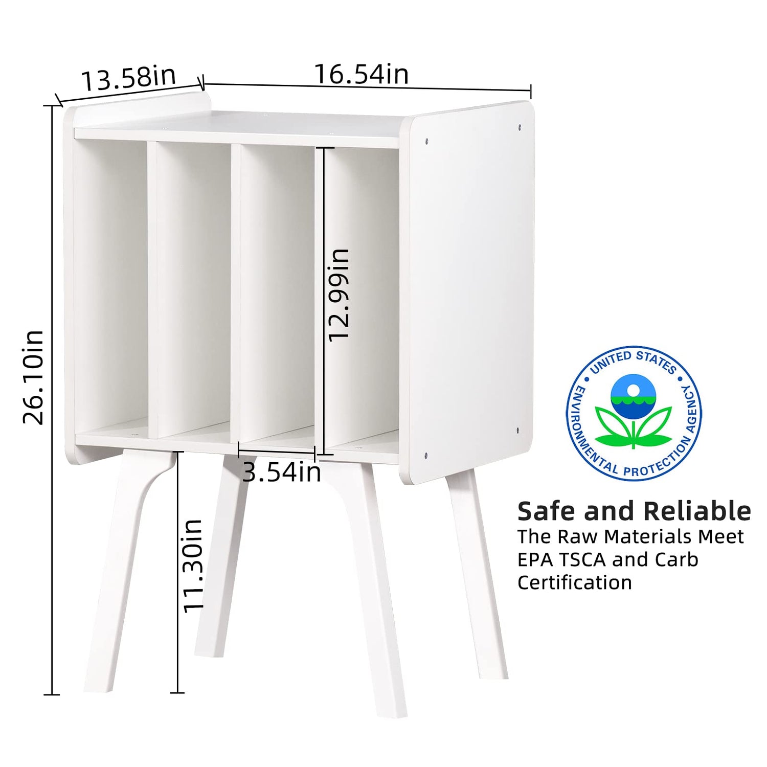 - 【Small Footprint But Large Storage Space】The 4 cube modern Record Player Stand adopts a simple vertical design, which reduces the complexity and saves space to a great extent. Its size is 16.5 '' L x 13.4 '' W x 26.1'' H . The spacious top and four rectangular storage spaces can hold more than 100 records. This record cabinet is designed to store vinyl records and media essentials while hosting your record player.