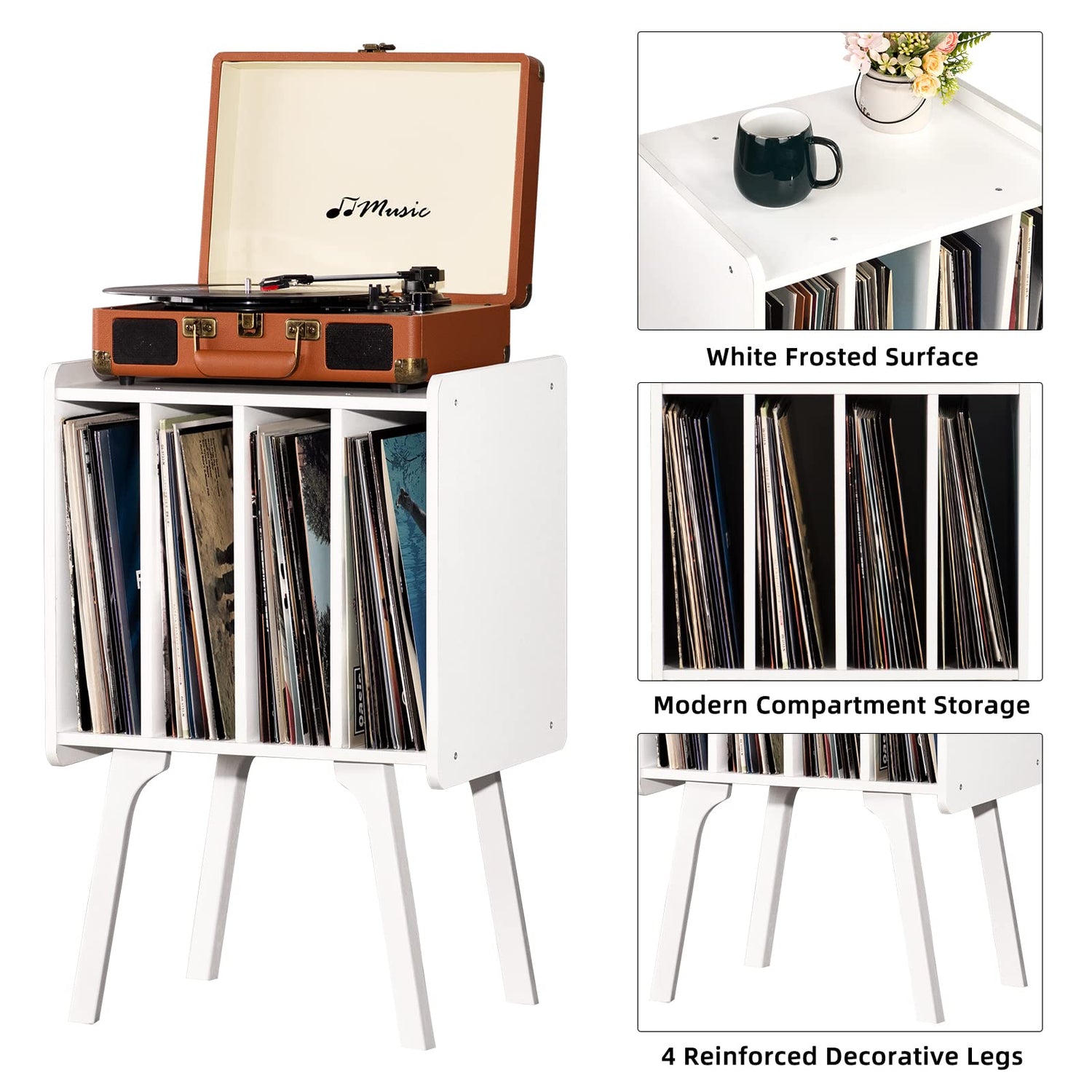 - 【Reliable Materials Create Stable Structure】The strong rustic white record player display holder is made of durable sturdy wooden boards and solid wood legs reinforced by special screws to ensure durability and stability. Thickened tabletop and reinforced table legs not only ensures large weight capacity(75 lb), but also creates a clean-cut silhouette for a touch of visual intrigue. The high-quality materials used in the wooden vinyl record holder escort your safe and healthy life.