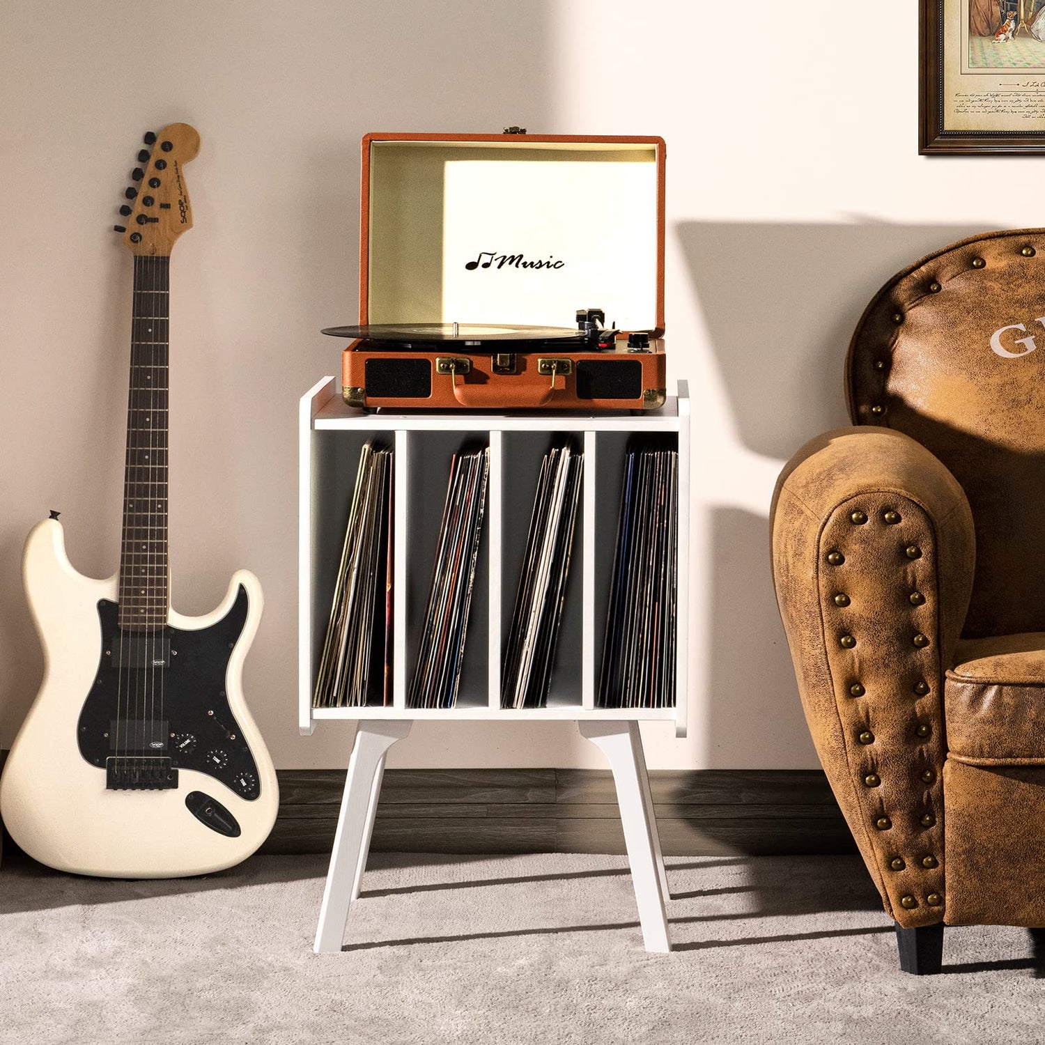 - 【Mid Century Modern Record Player Stand】Transform your living space with retro modern minimalist furniture. This vinyl record storage cabinet holder uses a rustic white natural wood grain design with solid wood decorative legs. It retains the retro wood texture, but without losing the modern pop style. An organic aesthetic, delicate linear detail, and novel flared profile bring iconic style to this mid-century turntable display stand.