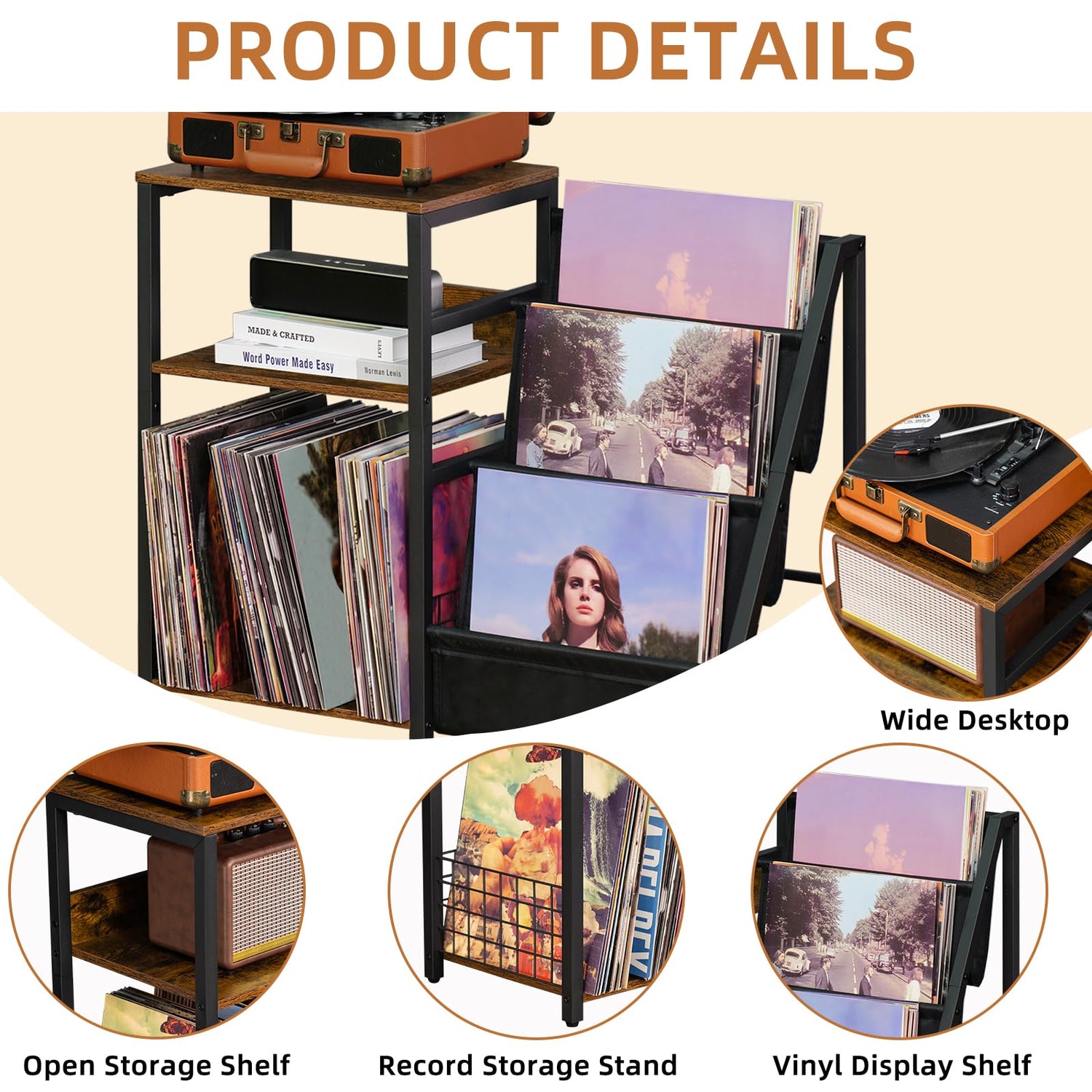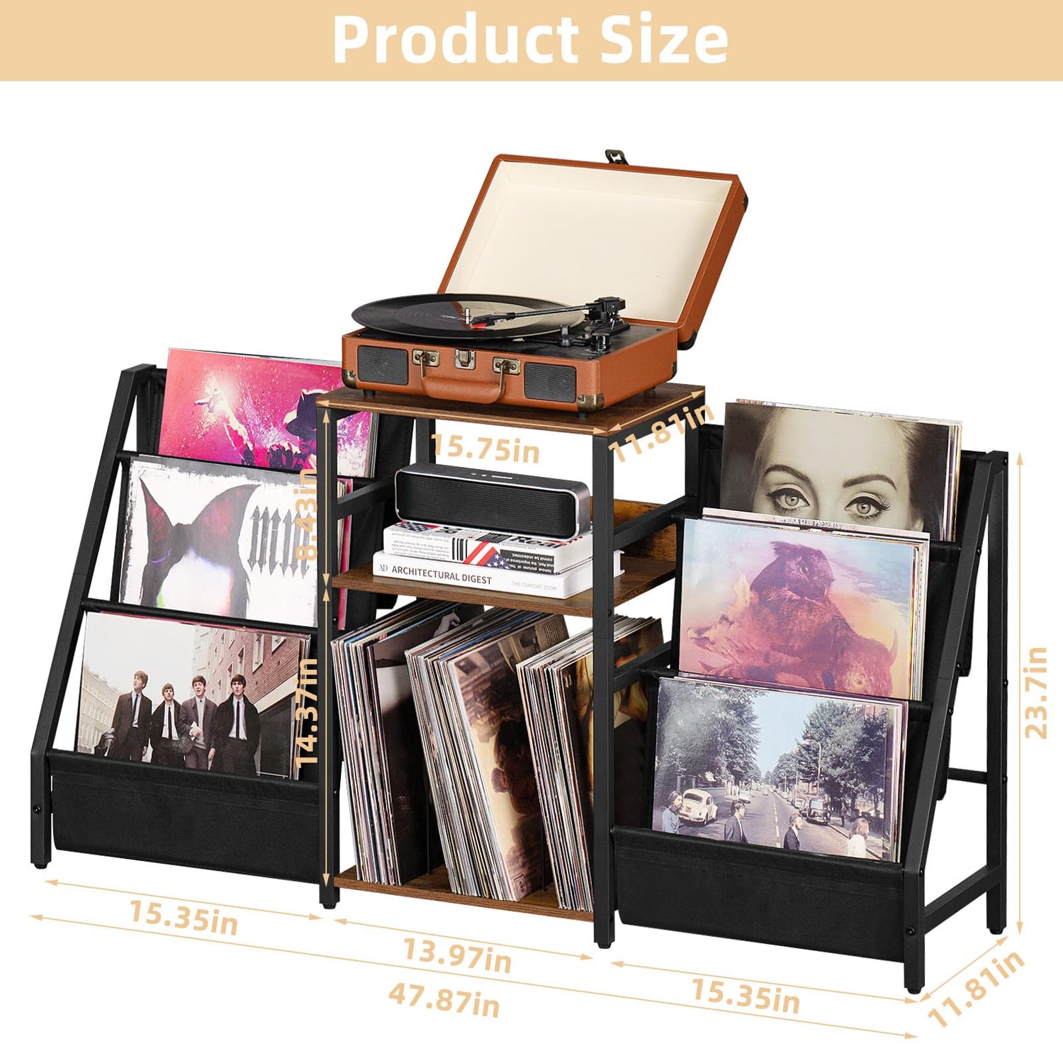 - [Turntable Stand with Display Shelf] We have added 6 pocket of vinyl display shelves made of thicken Oxford cloth next to the end table.You can display your favorite albums, and because it can display the front of the vinyl record, it also can helps you find records more convenient,bringing you the experience of being in a vinyl record library.