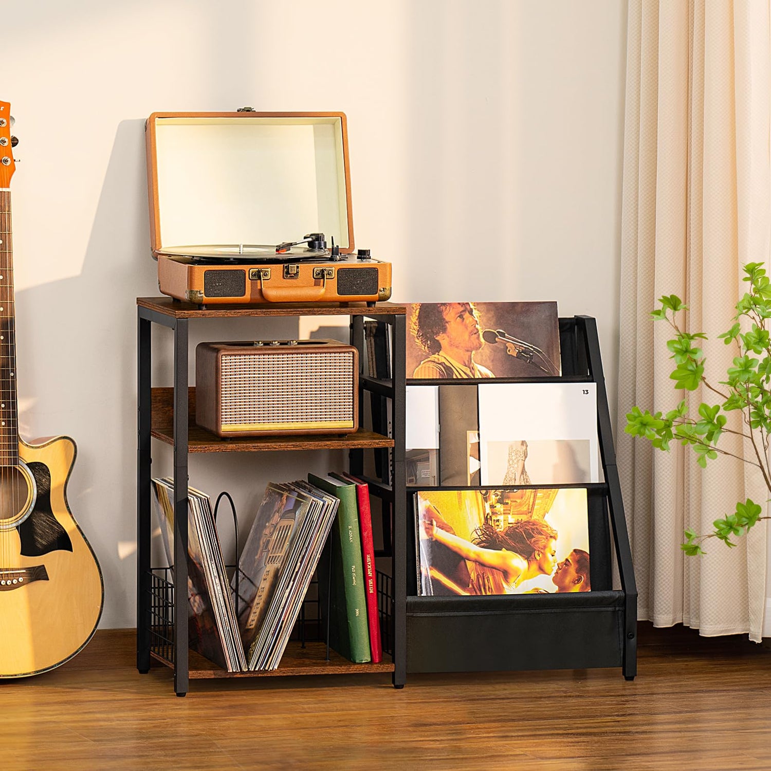 - [Multi-Functional Holder] The record table can be used not only as a vinyl record organizer cabinet, but also as a wide magazine rack in the office, bedroom, study or wherever else reading material is needed.The deep pockets of the display shelf are perfect for holding your beloved magazines and periodical book, accompanying you through every good pleasant reading time.