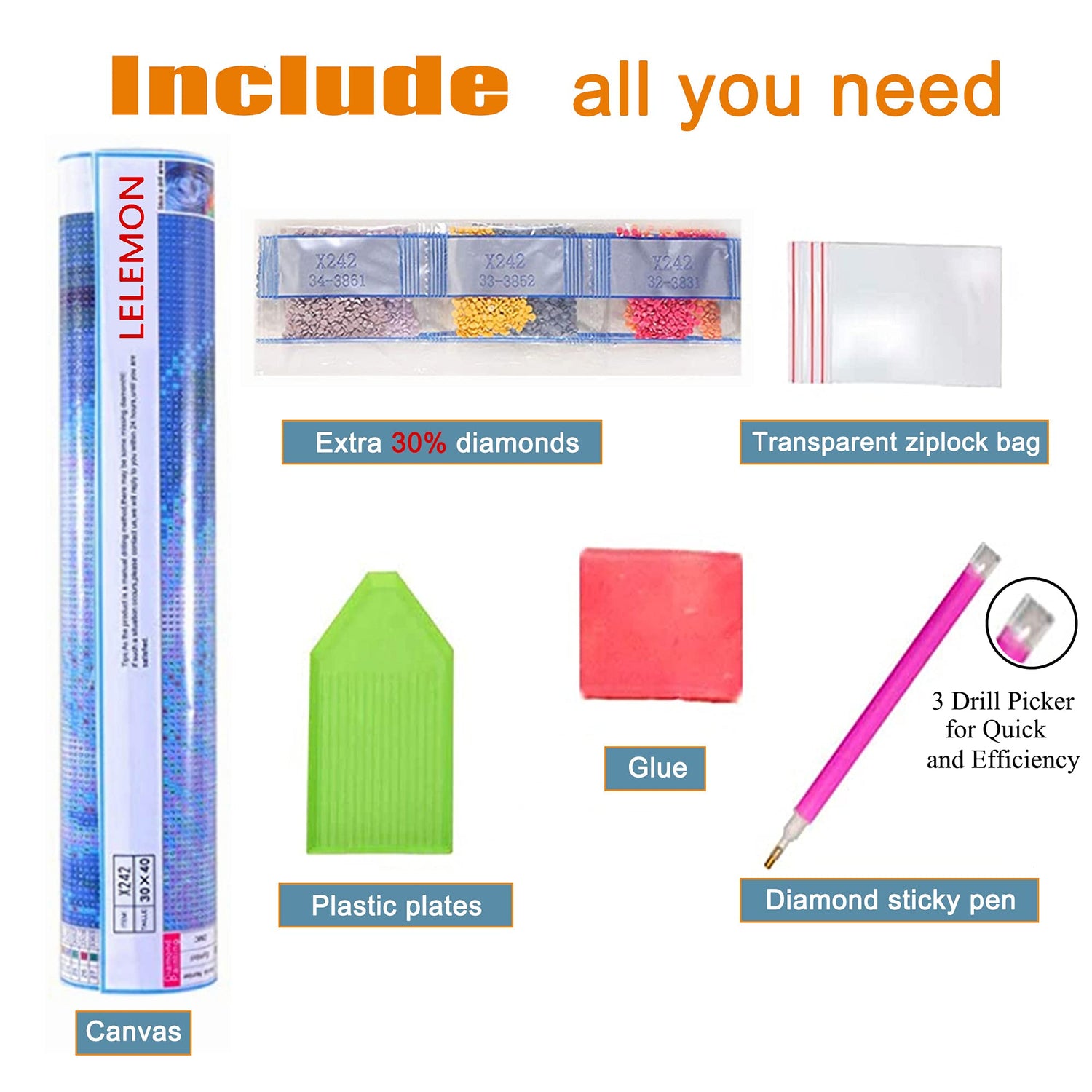 - 【Full Drill Diamond Painting Kit】 Our diamond painting has complete diamond art accessories and tools.The diamond painting accessories and diamond painting tools include HD print canvas,diamond painting pen,diamond painting wax, transparent ziplock bags,diamond painting trays and sufficient number of round diamonds ( matching the canvas color codes).Spend less money get more diamond paintings.The complete diamond painting can be stored for more than 10 years