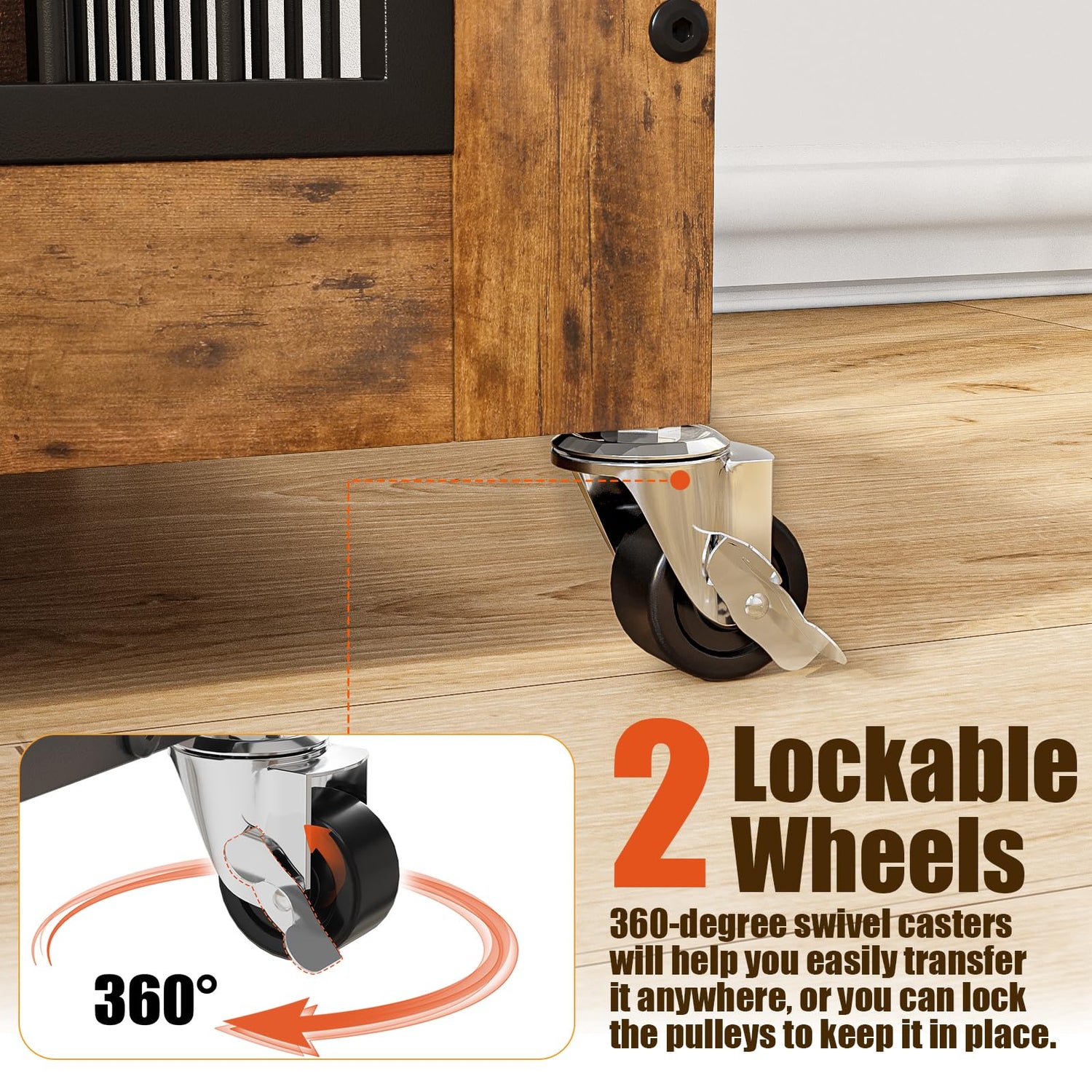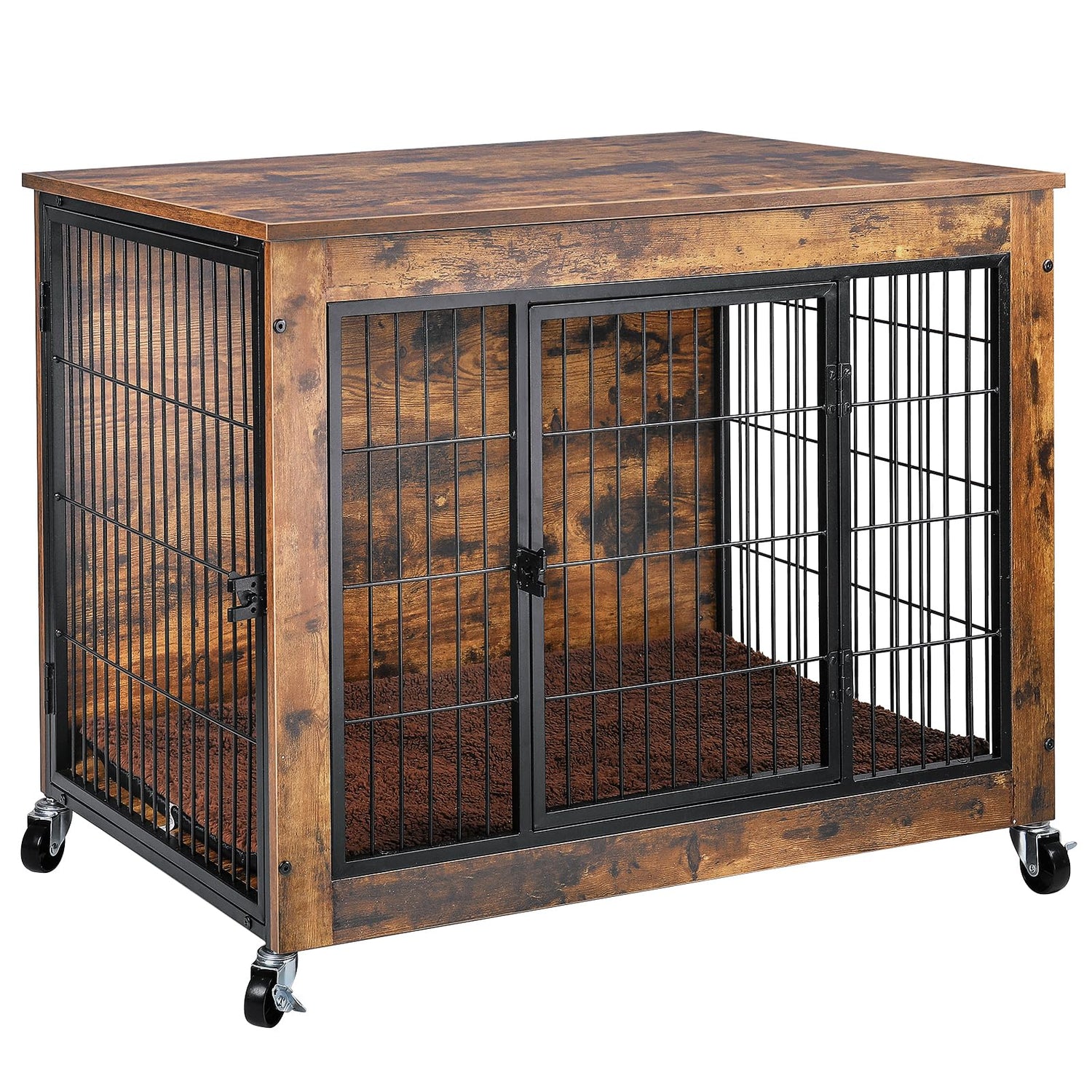 - Furniture Dog crate with Wheels: 360° rotating wheels, facilitating easy movement of the crate, and 2 of them come with locks to secure the dog crate in place. So you can easily transfer it anywhere, or you can lock the pulleys to keep it in place.