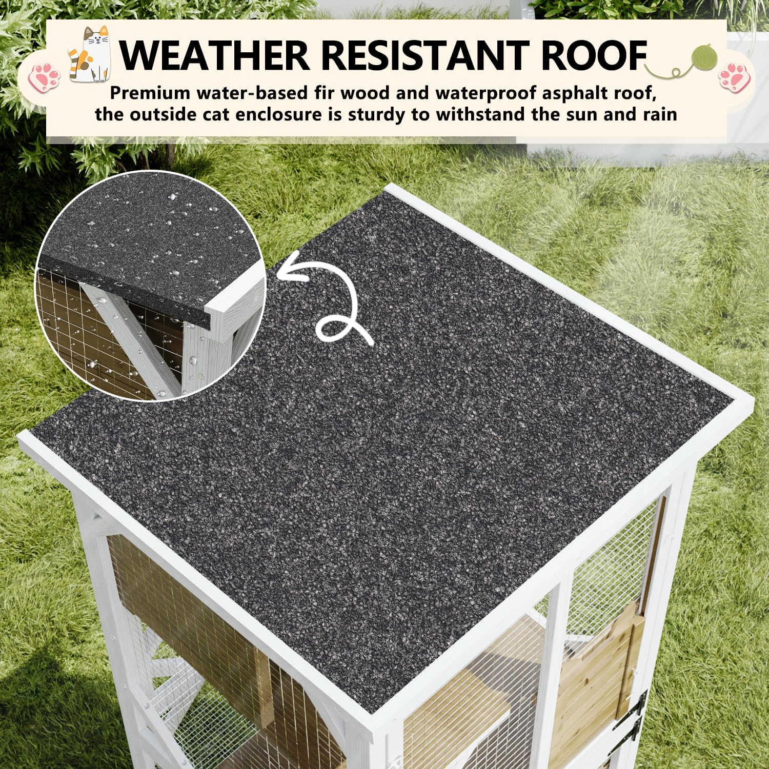 LEMBERI Cat House Outdoor Catio Cat Enclosures on Wheels, 71" Large Outside Patio Wooden Cat Cage Resting Box,Scratching Post, Waterproof Roof (White, 71")
