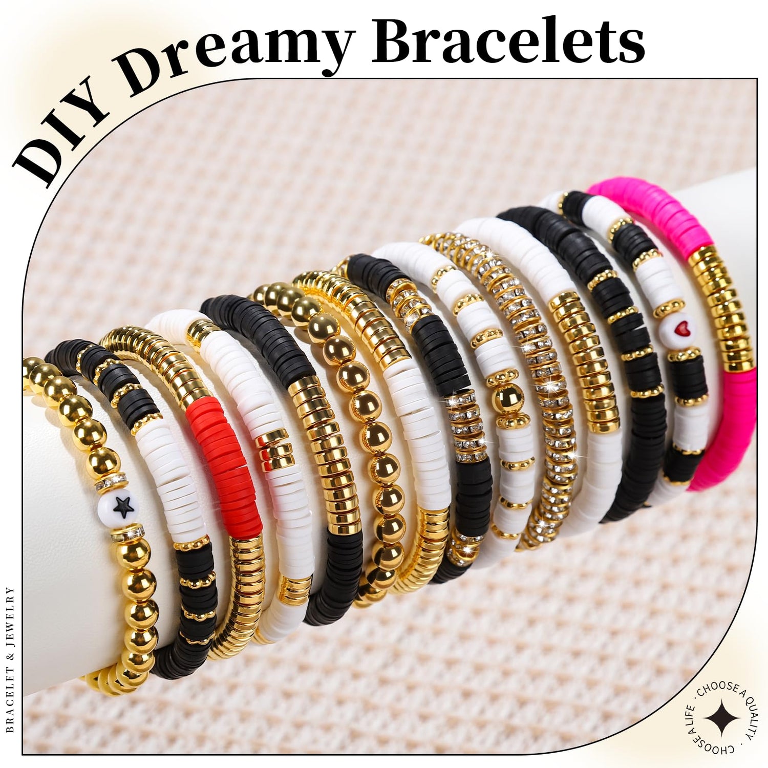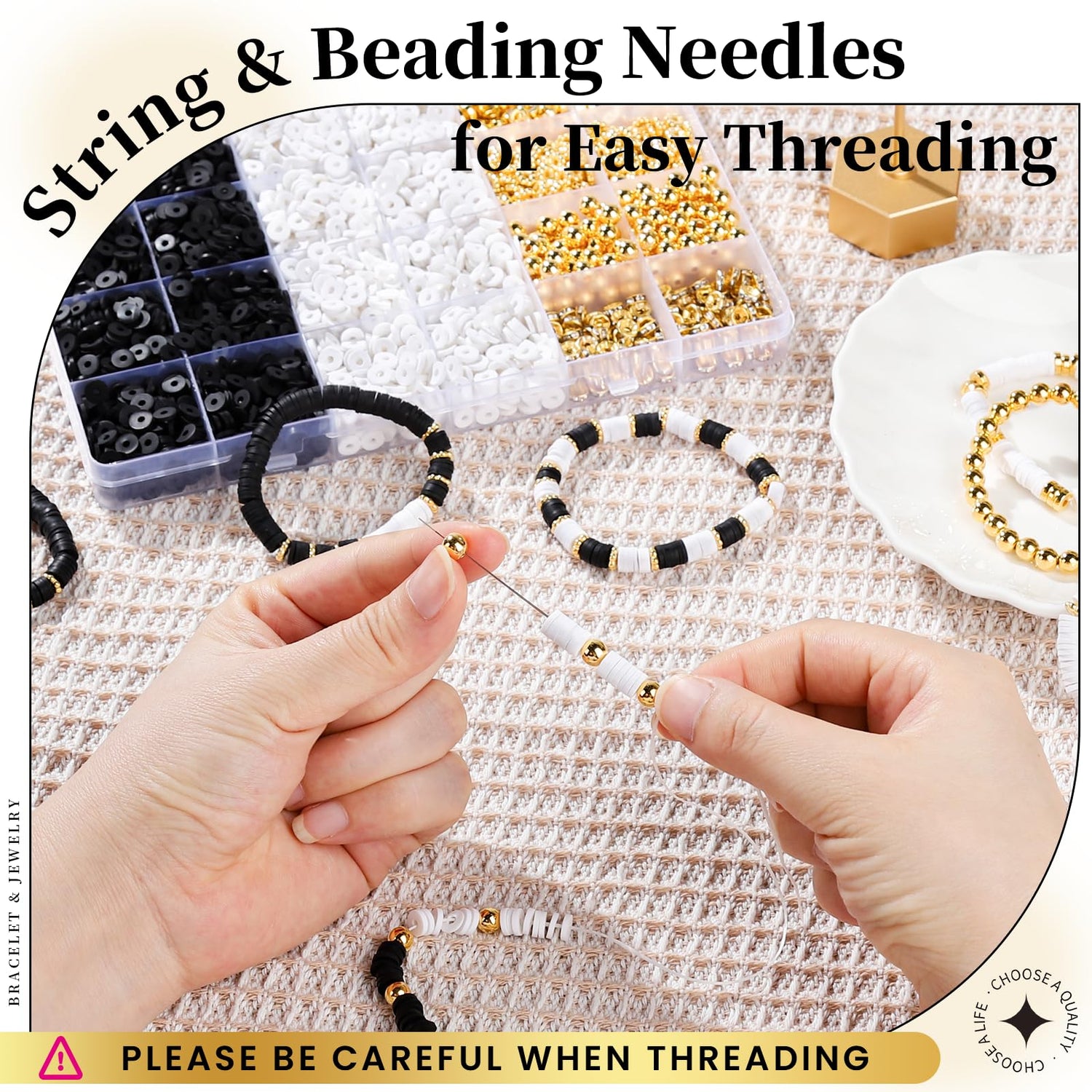 - 3524pcs Bracelets Making Kit: 1600pcs Black Clay Beads, 1600pcs White Clay Beads, 320 Gold Beads, all packed neatly in a handy storage case with compartments. Plus, come with 2 rolls 0.8mm 10m elastic bracelet string, and 2pcs beading needles for easy beading.