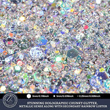 - 160G Holographic Silver Chunky Glitter: Net weight: 160g/5.64oz silver glitter, pretty large amount of craft glitter, supports a wide range of DIY projects, resin art crafts, nail art design, makeup, DIY glitter paint etc.. Gorgeous shiny holographic diamond silver glitter, metallic silver finish along with secondary rainbow color, shines stunningly under light.