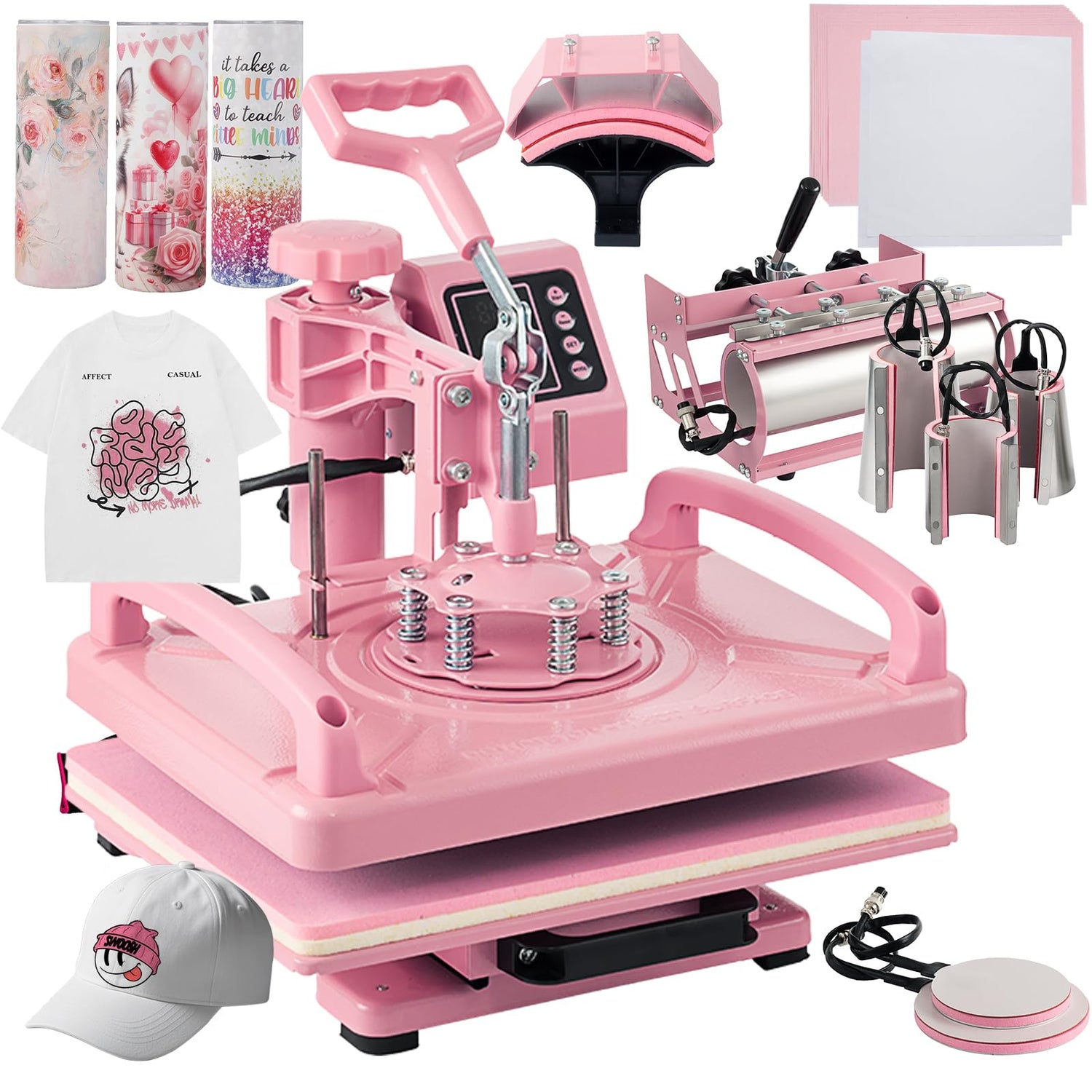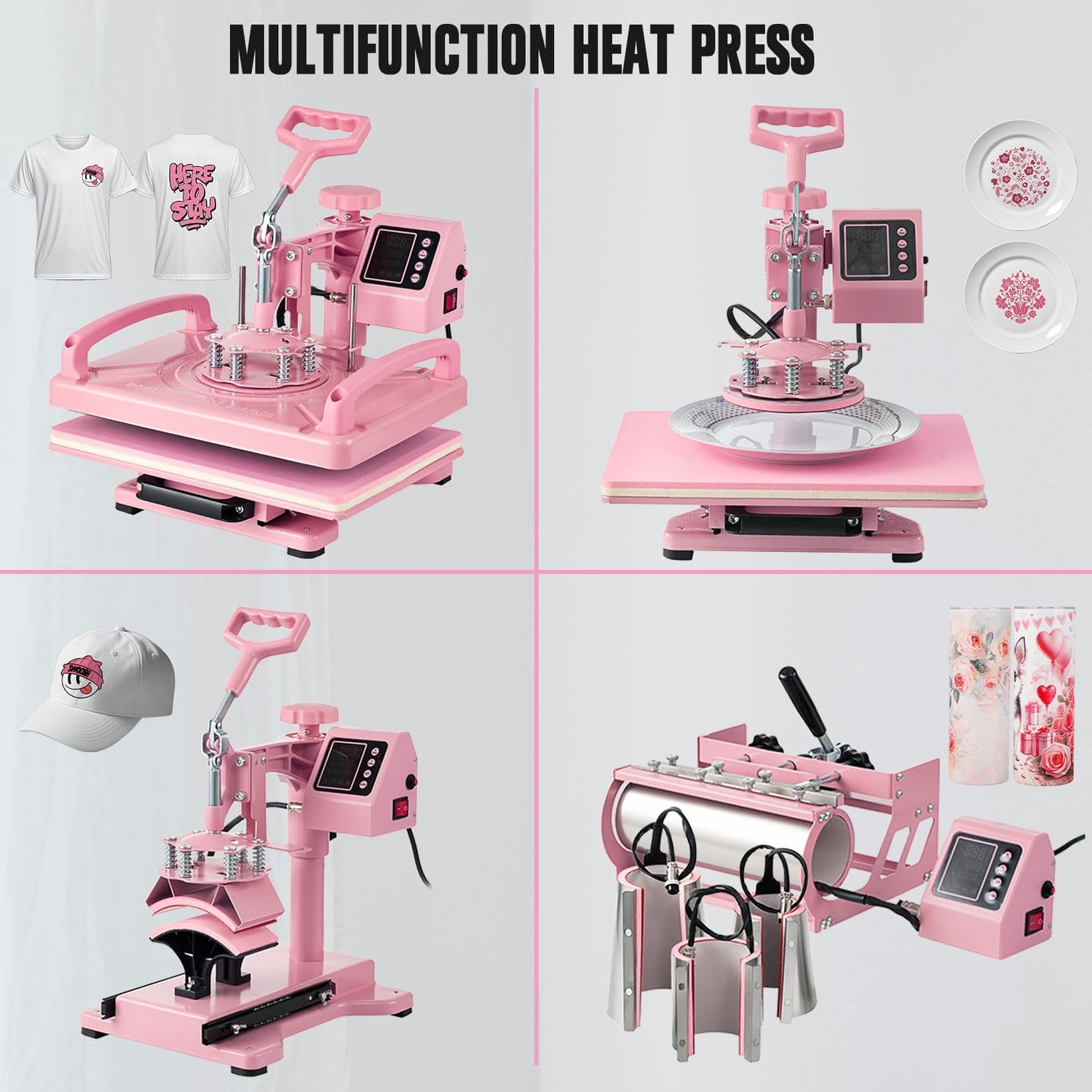 - 8IN1 HEAT PRESS MACHINE -- With this versatile machine, you get a 12"x15" T-shirts press machine, a 5.5"x 3" Hat press, 30oz tumbler press,9oz,12oz&17oz mug press, a 5" Plate Press, and a 6" Plate Press. Unlock the creative possibilities with our heat press machine! Print designs effortlessly onto various items like T-shirts, canvas bags, pillowcases, caps, mugs, tumblers, ceramic plates, and beyond using heat transfer techniques. Dive into DIY projects with ease and make your crafting endeavors both simple and fun!