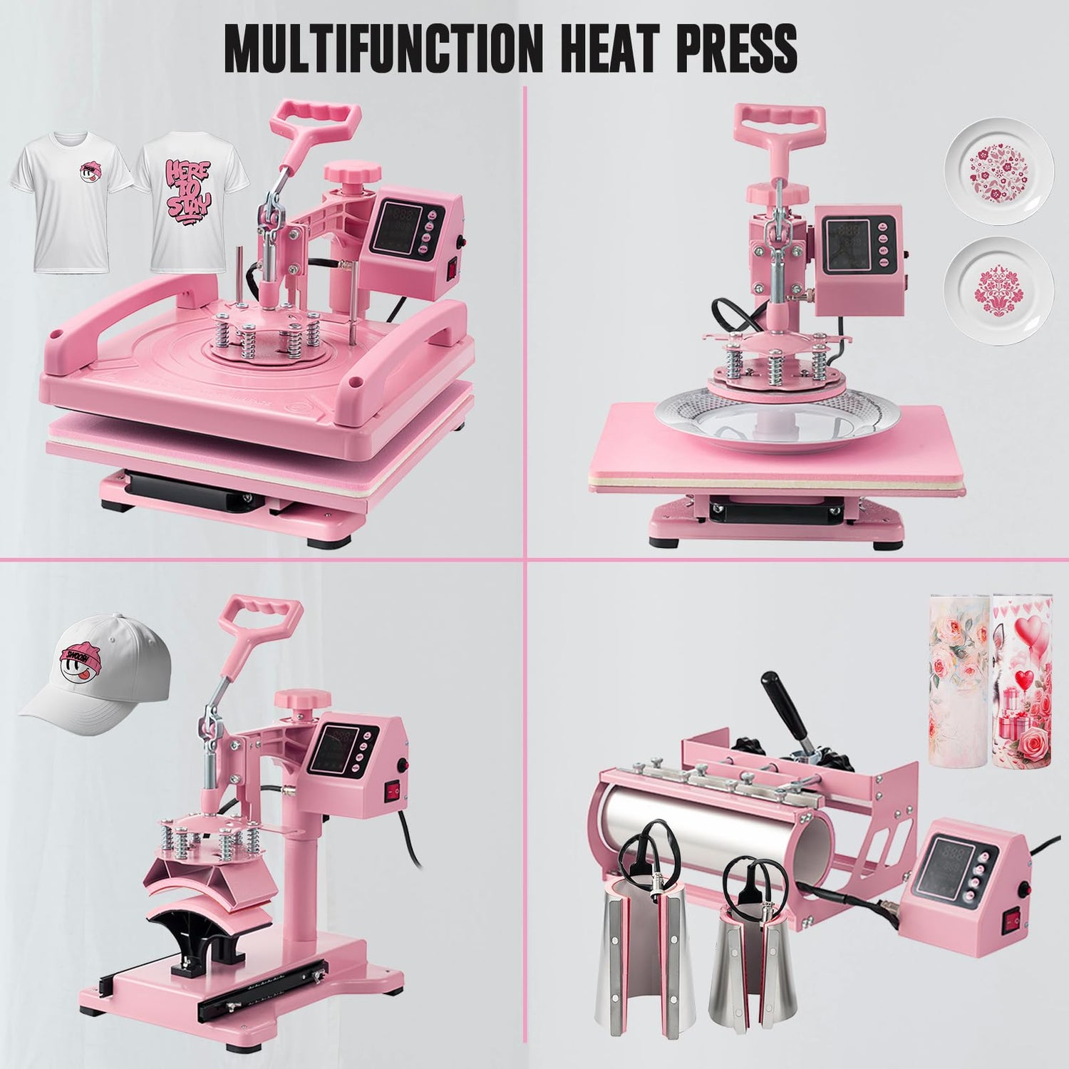 - 8IN1 HEAT PRESS MACHINE -- With this versatile machine, you get a 15"x15" T-shirts press machine, a 5.5"x 3" Hat press, 30oz tumbler press,12oz&17oz mug press, a 5" Plate Press, and a 6" Plate Press. Unlock the creative possibilities with our heat press machine! Print designs effortlessly onto various items like T-shirts, canvas bags, pillowcases, caps, mugs, tumblers, ceramic plates, and beyond using heat transfer techniques. Dive into DIY projects with ease and make your crafting endeavors both simple and fun!