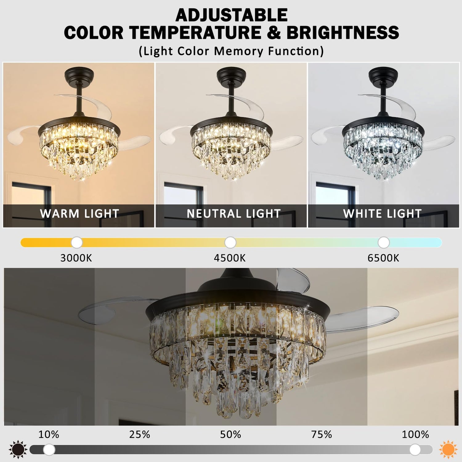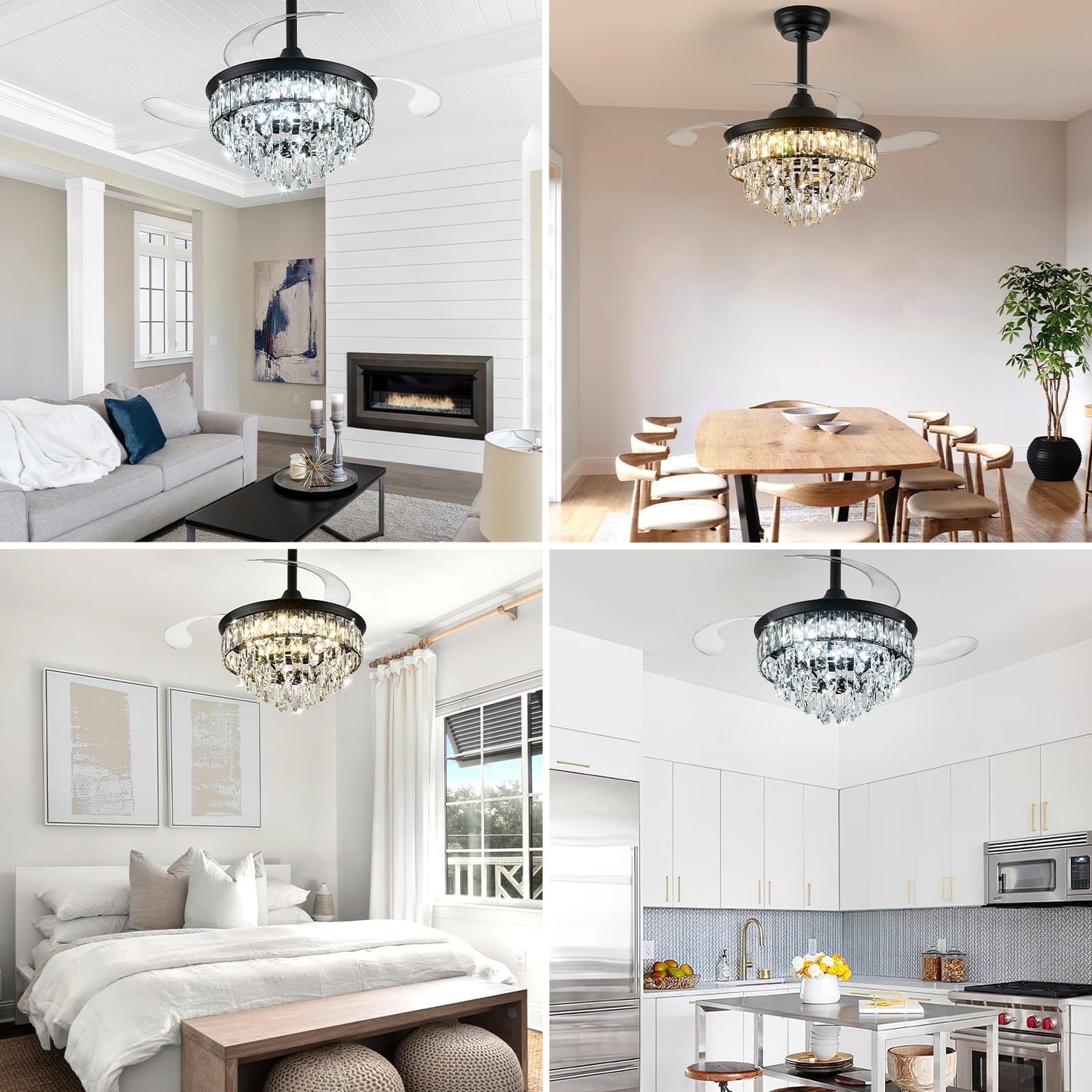 LEONTYNE 36 inch Fandelier Ceiling Fan with Light and Remote LED Dimmable Crystal Ceiling Fan 3 Blades 6 Speeds Invisible Retractable Ceiling Fan for Bedroom Living Room Dining Room (Black)
