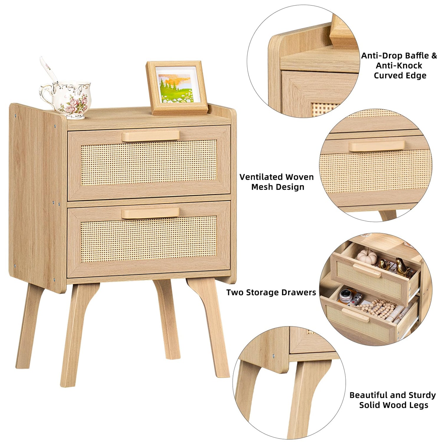- [Ample Storage & Reliable Material] Spacious desktop with two woven mesh drawers is enough to store your family photos, lamps, books, alarm clocks and more, which can meet your storage needs. The boho side table is made of sturdy wood boards and high quality beech legs, which is sturdy and stable. The light wood nightstand will stay with you for years.