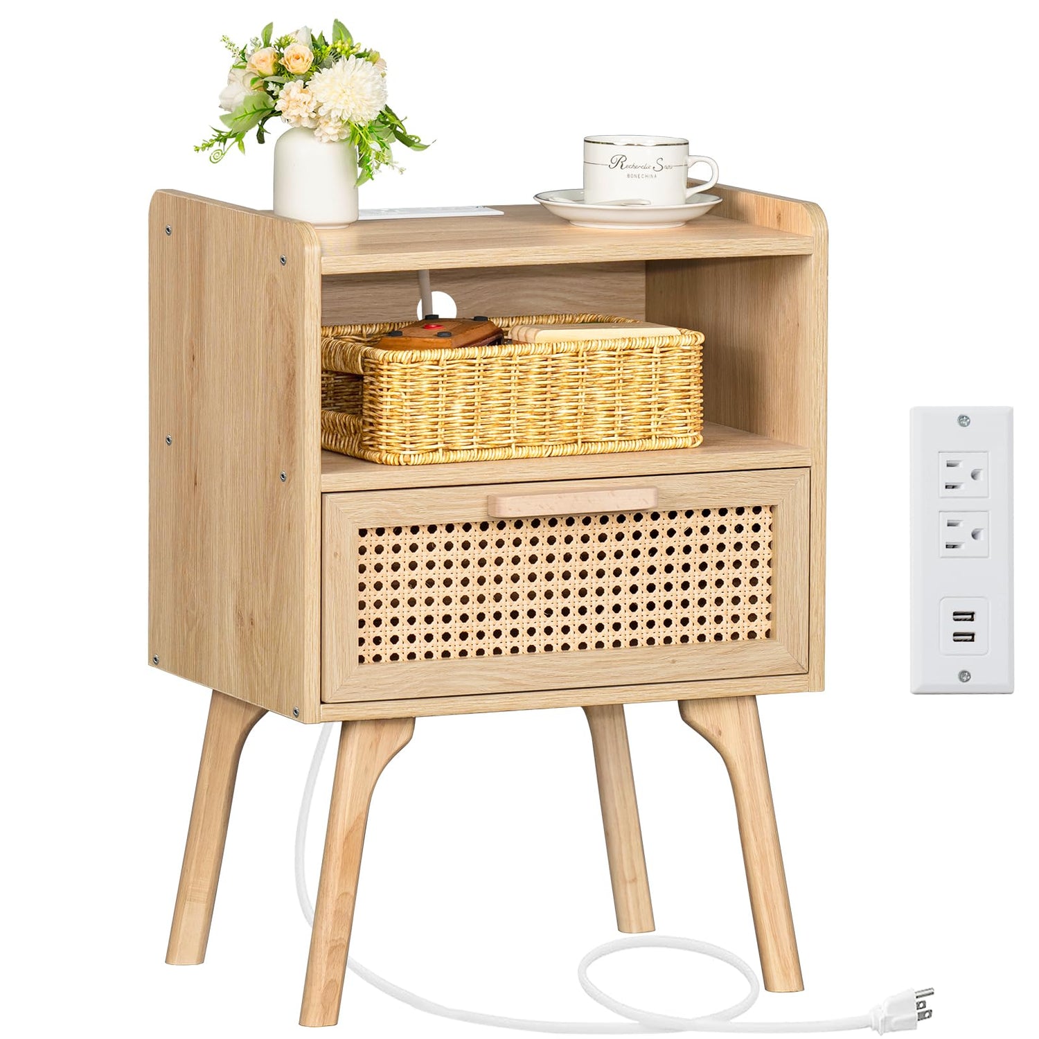 - [Rattan Nightstand with Charging Station] The wood texture rattan night stand combines modern style and boho element. It is suitable for many styles of home decor and can help you transform your living space. The cane decorated drawer is beautiful and practical. Rattan furniture brings a perfect visual effect and adds charm to your home. 2 standard plug outlets and 2 USB ports allow you to charge multiple electronic devices at the same time. Everything is at your fingertips.