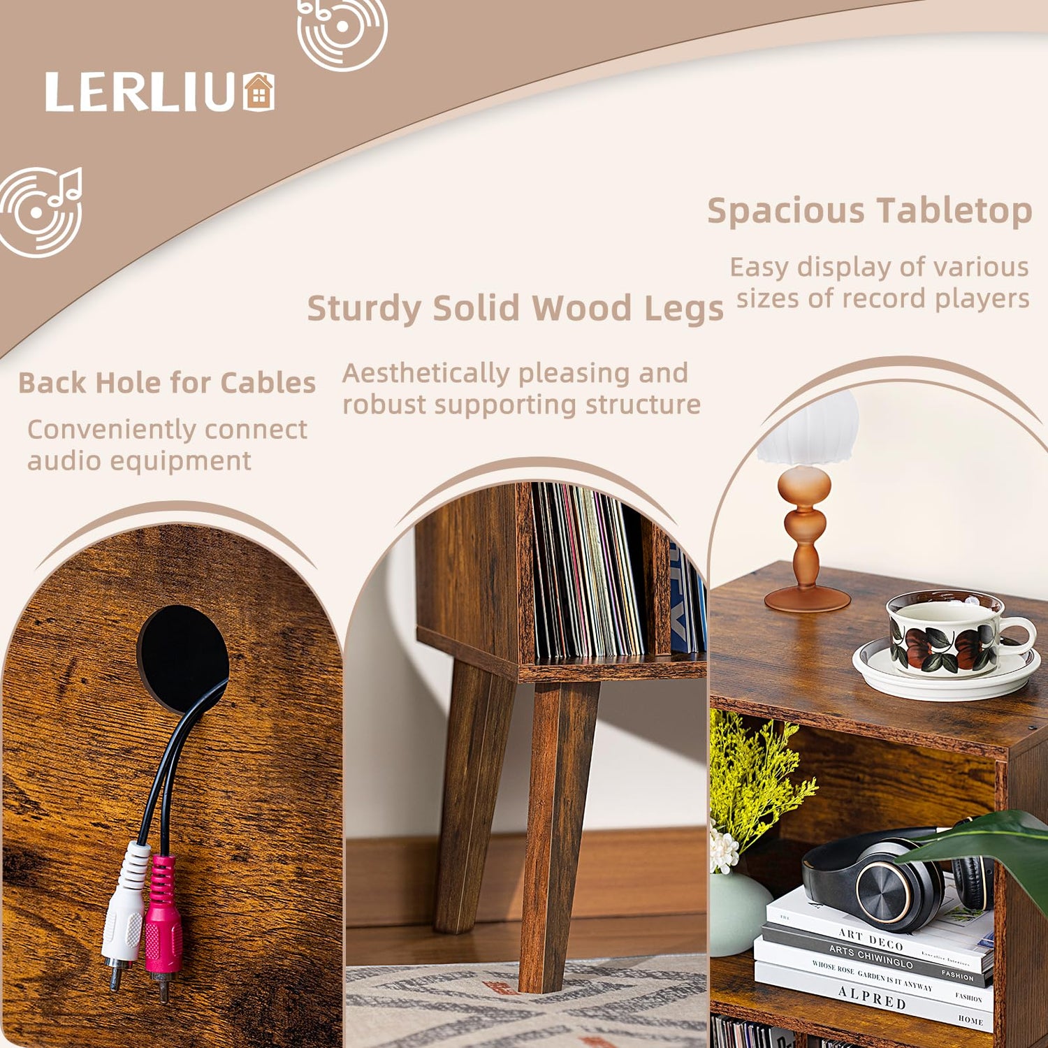 - 【Sturdy Angled Solid Wood Legs】We choose high-quality solid wood materials to make the slanted table legs.The solid wood table legs make the structure of the record player storage more sturdy, while creating a superior texture.The inside of the bold slanting table legs is reinforced with special screws.The sturdy support structure of the record cabinet makes it fearless of the test of time, and it precipitates a unique and calm atmosphere as time passes by.