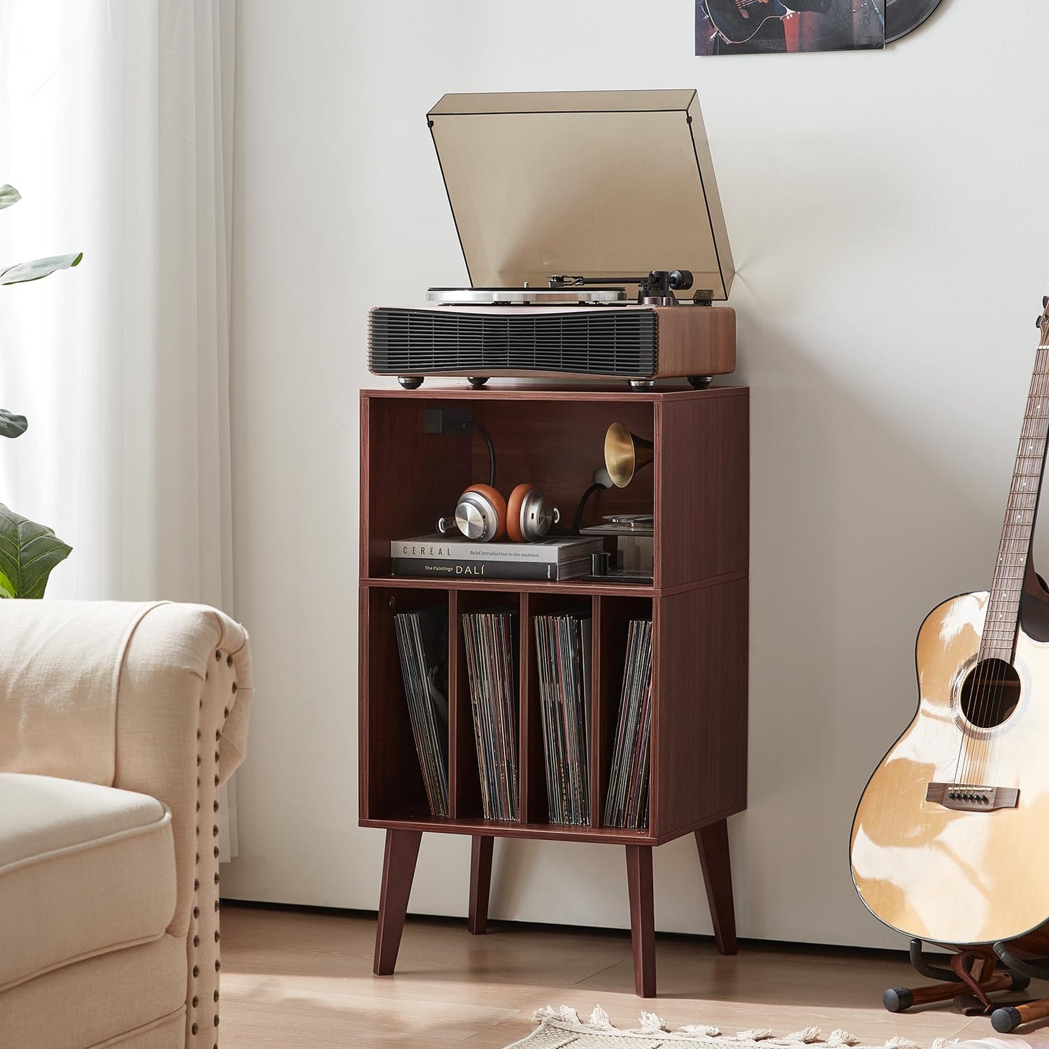 Lerliuo Record Player Stand with Charging Station, Walnut Turntable Stand Holds up to 160 Albums, Mid-Century Vinyl Storage Cabinet Table with Wood Legs, Record Holder Dispaly Shelf for Living Room